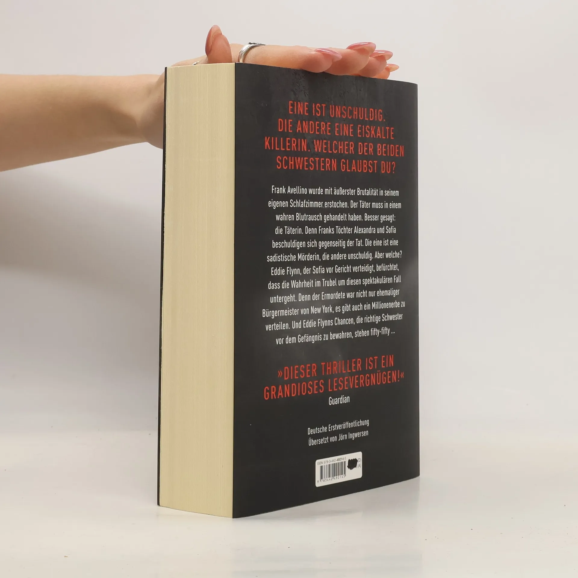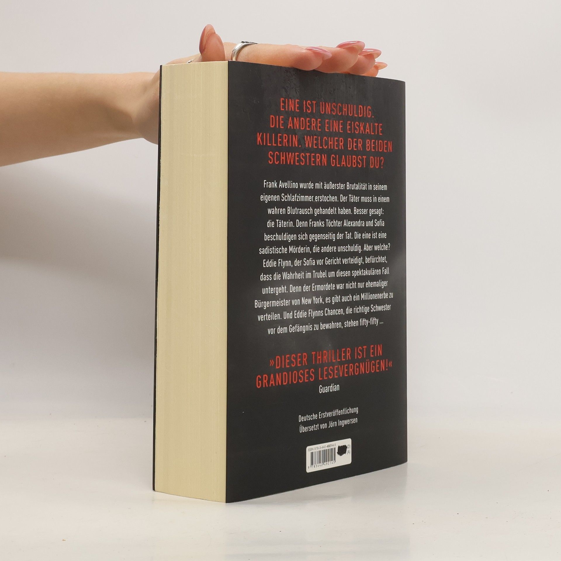 Eine ist unschuldig. Die andere eine eiskalte Killerin. Welcher der beiden Schwestern glaubst du? Frank Avellino wurde mit äußerster Brutalität in seinem eigenen Schlafzimmer erstochen, der Täter muss in einem wahren Blutrausch gehandelt haben. Besser gesagt: die Täterin. Denn Franks Töchter Alexandra und Sofia beschuldigen sich gegenseitig der Tat. Die eine ist eine sadistische Mörderin, die andere unschuldig. Aber welche? Sowohl Eddie Flynn, der Sofia vor Gericht verteidigt, als auch Alexandras junge Anwältin Kate Brooks befürchten, dass die Wahrheit im Trubel um diesen spektakulären Fall untergeht. Denn der Ermordete war nicht nur ehemaliger Bürgermeister von New York, es gibt auch ein Millionenerbe zu verteilen. Und Eddie Flynns Chancen, die richtige Schwester vor dem Gefängnis zu bewahren, stehen fifty-fifty ...