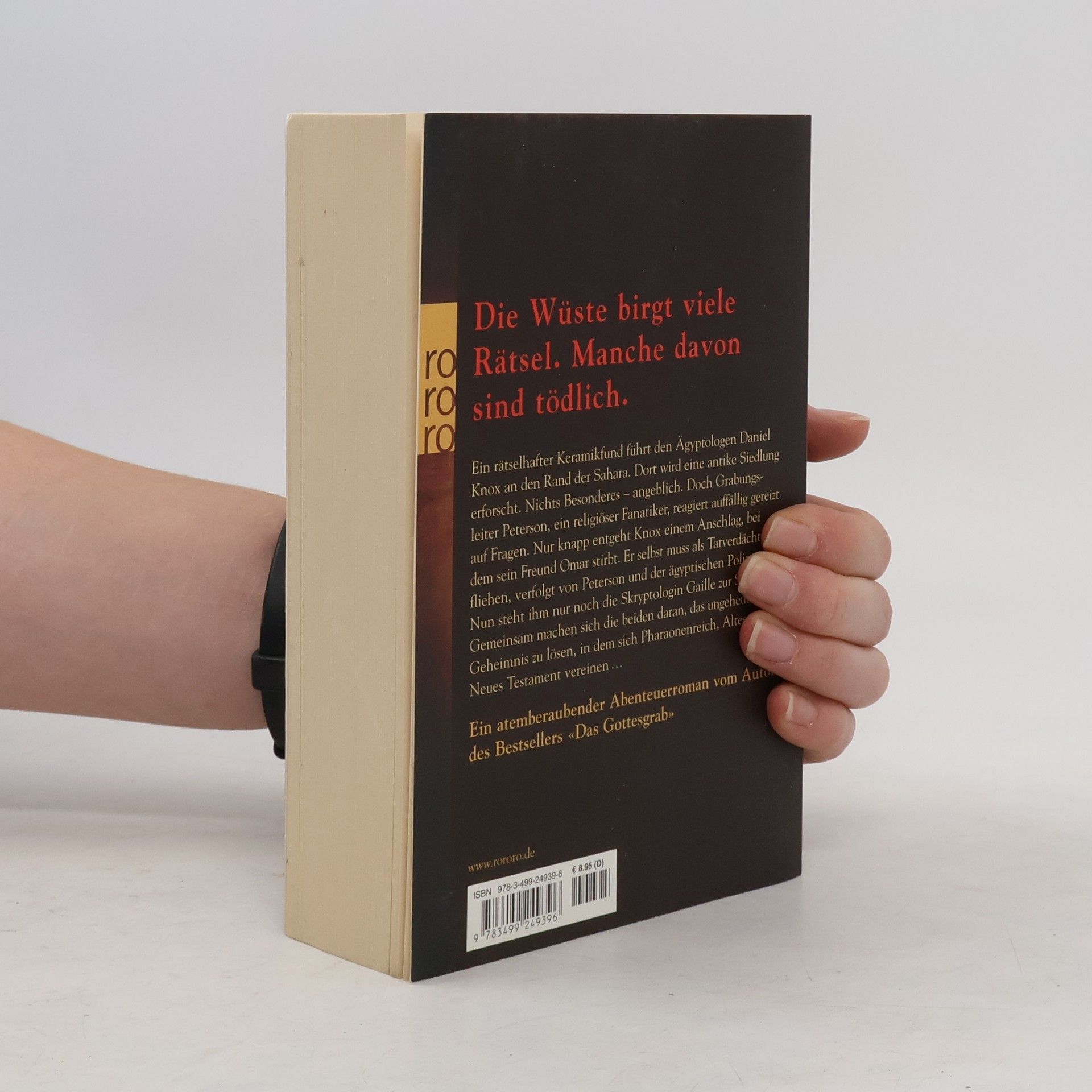 Die Wüste birgt viele Rätsel. Manche davon sind tödlich.Ein rätselhafter Keramikfund führt den Ägyptologen Daniel Knox an den Rand der Sahara. Dort wird eine antike Siedlung erforscht. Nichts Besonderes – angeblich. Doch Grabungsleiter Peterson, ein religiöser Fanatiker, reagiert auffällig gereizt auf Fragen. Nur knapp entgeht Knox einem Anschlag, bei dem sein Freund Omar stirbt. Er selbst muss als Tatverdächtiger fliehen, verfolgt von Peterson und der ägyptischen Polizei. Nun steht ihm nur noch die Skryptologin Gaille zur Seite. Gemeinsam machen sich die beiden daran, das ungeheuerliche Geheimnis zu lösen, in dem sich Pharaonenreich, Altes und Neues Testament vereinen....Ein atemberaubender Abenteuerroman vom Autor des Bestsellers «Das Gottesgrab»