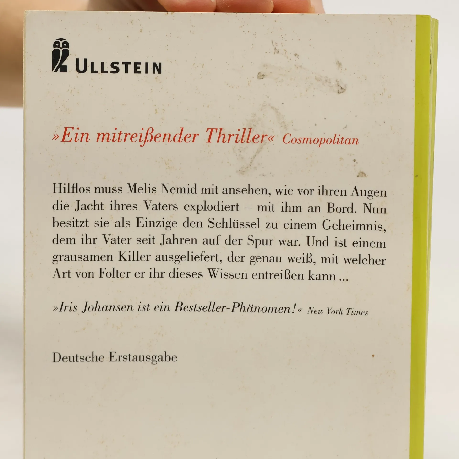 Hilflos muß Melis Nemid mit ansehen, wie vor ihren Augen die Jacht ihres Vaters explodiert - mit ihm an Bord. Nun besitzt sie als einzige den Schlüssel zu einem Geheimnis, dem ihr Vater seit Jahren auf der Spur war. Und ist einem grausamen Killer ausgeliefert, der genau weiß, mit welcher Art von Folter er ihr dieses Wissen entreißen kann