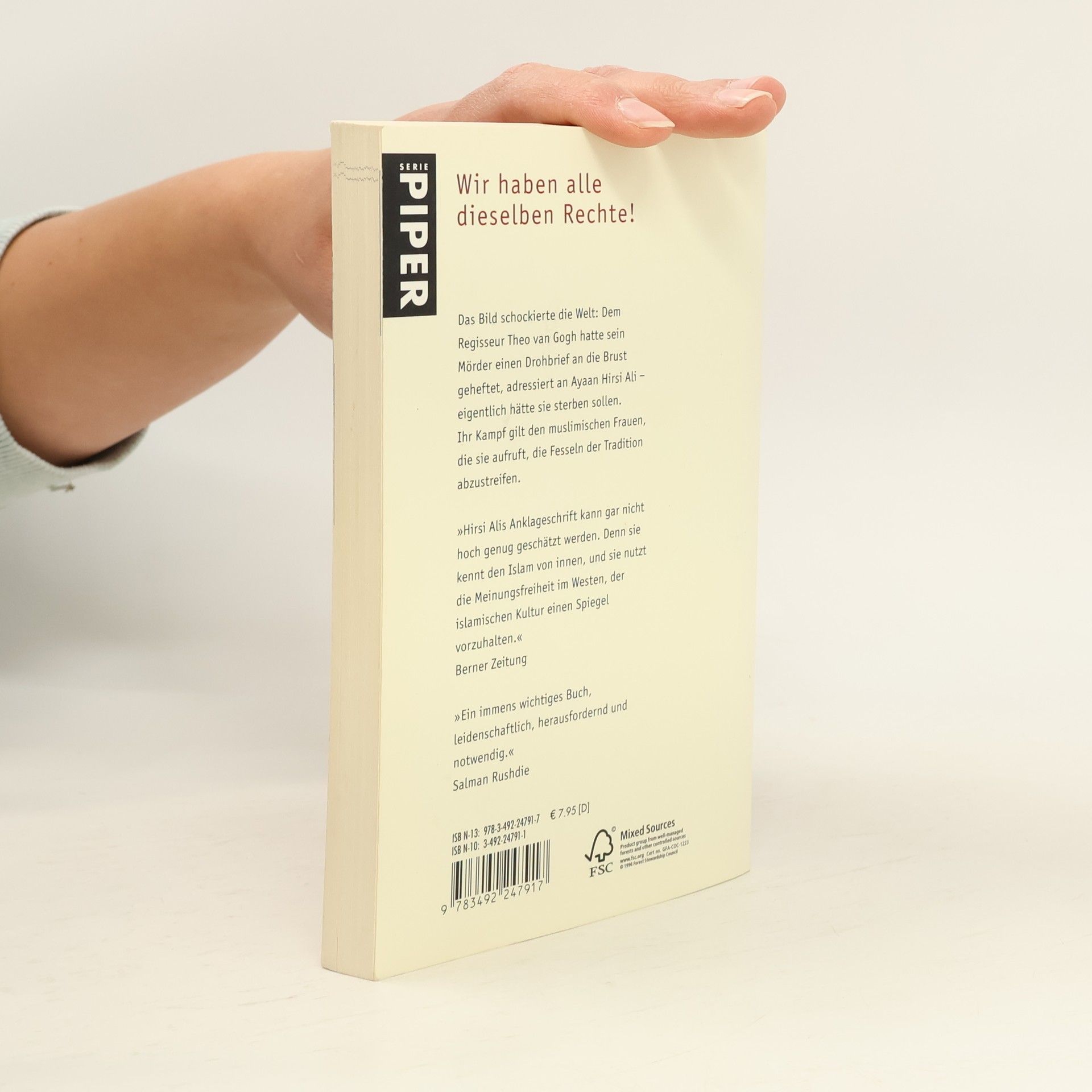 Das Bild schockte die Welt: Der tote Filmregisseur Theo van Gogh, dem sein Mörder einen Drohbrief an die Brust geheftet hatte. Adressiert an Ayaan Hirsi Ali – eigentlich hätte sie sterben sollen. Sie weiß, daß ihr Kampf für die unterdrückten islamischen Frauen lebensgefährlich ist – aber sie wird, wie dieses Buch beweist, nicht aufgeben. Denn sie weiß, wovon sie redet: Der Zwangsheirat, die ihr Vater für sie arrangiert hatte, konnte sie sich nur durch Flucht entziehen. Der Bruch mit ihrer Familie, ihren Freunden, waren die unausweichliche Folge. Seitdem kämpft sie für ihre Schicksalgenossinnen: damit sie nicht mehr nur 'Söhnefabriken' sind, daß sie studieren können, daß sie endlich selber bestimmen können, wie sie leben wollen. Nach dem Attentat ist Ayaan Hirsi Ali von den niederländischen Behörden außer Landes gebracht worden. In ihrem Versteck schrieb sie den letzten Beitrag zu diesem Buch: Der Kampf muß weitergehen. Deshalb kehrte sie jetzt zurück in die Öffentlichkeit. 'Ich werde weitermachen und ich muß auf harte Schläge gefaßt sein. Momentan stürzen sich alle Medien auf mich: eine schwarze Frau, die den Islam kritisiert. Aber der Tag wird kommen, wo es wieder Raum gibt für die Sache, um die es geht: die Abhängigkeit der muslimischen Frauen und die Tatsache, daß die Integration hauptsächlich wegen der frauenfeindlichen Kultur und Religion des Islam gescheitert ist.'