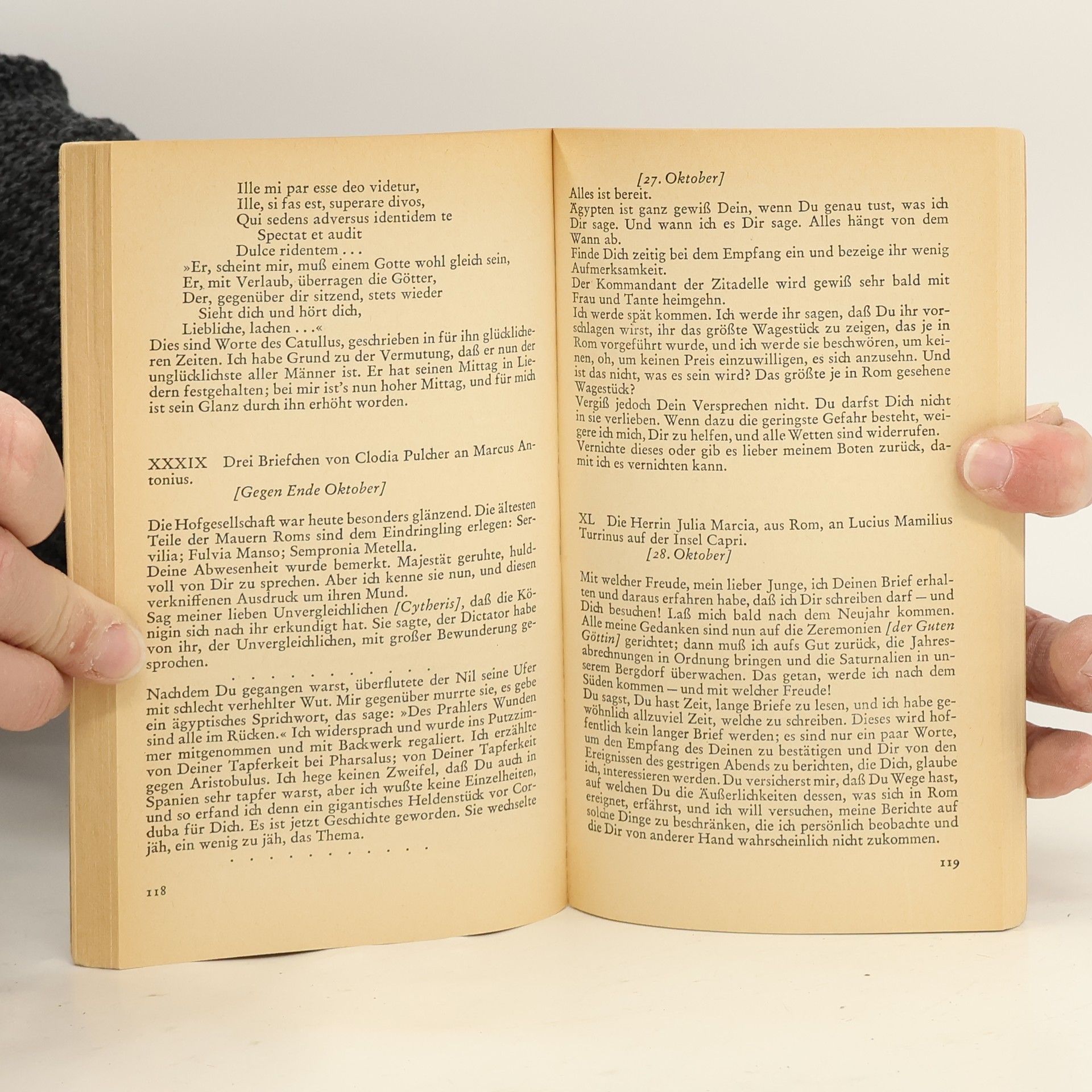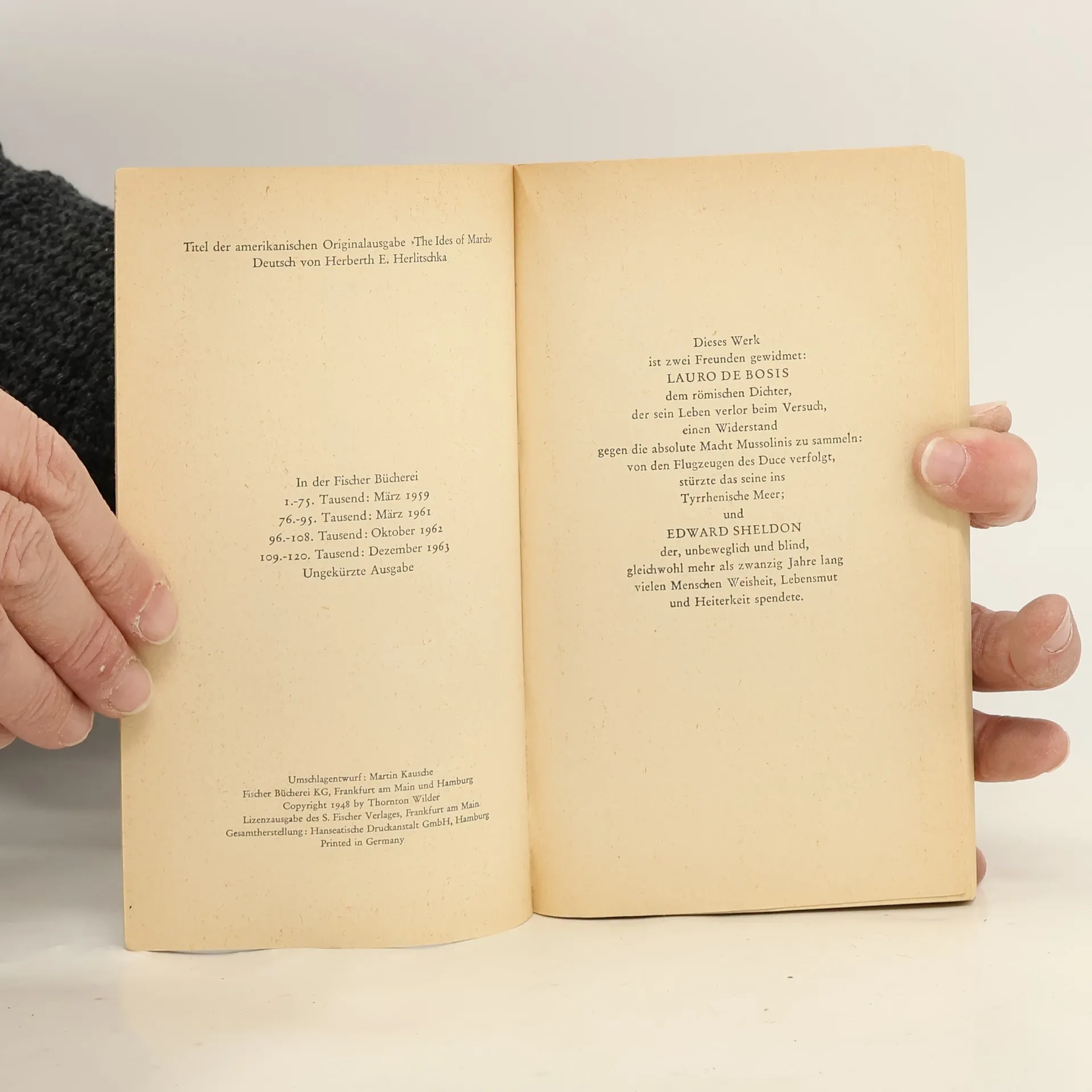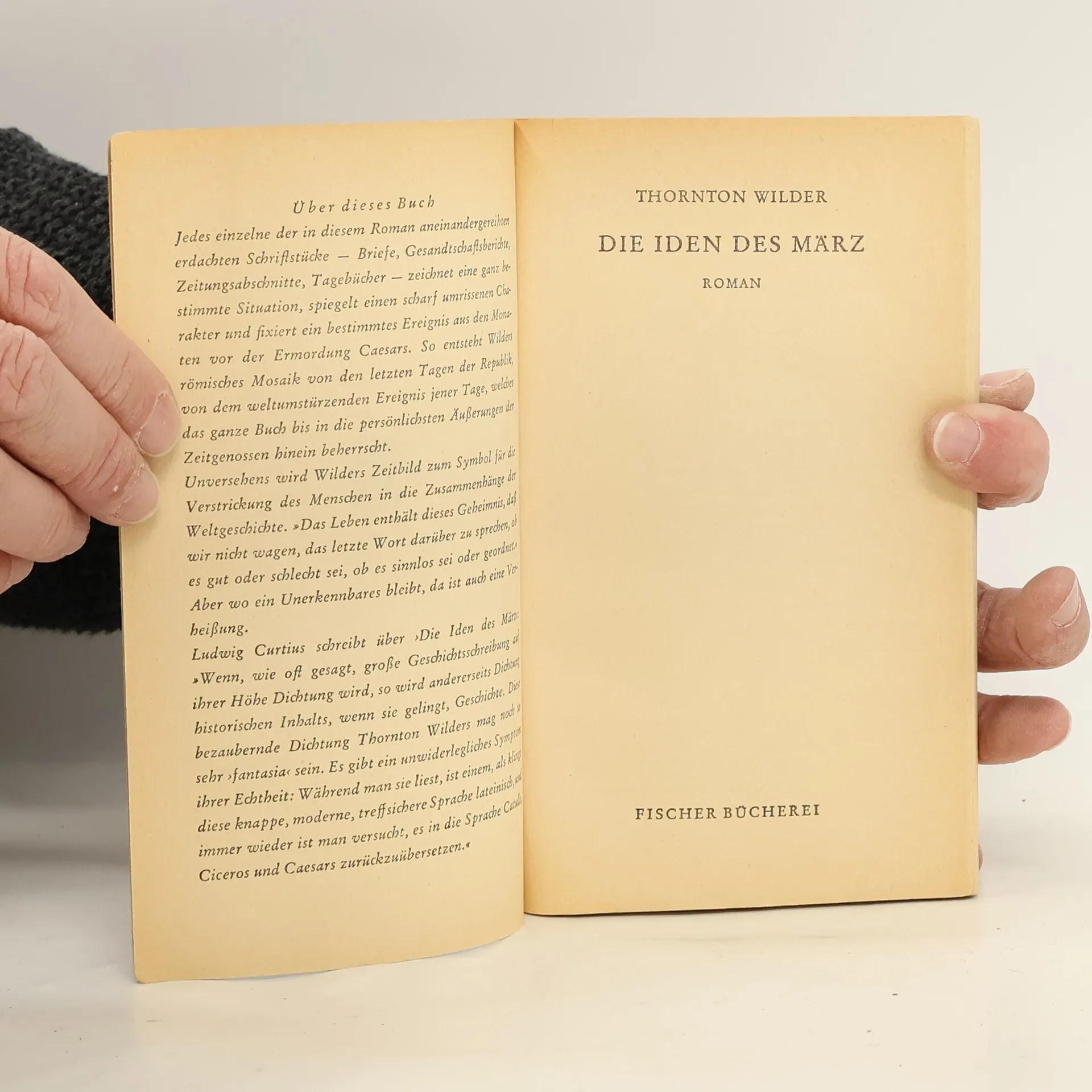 Nicht gefunden, erfunden worden sind, zweitausend Jahre nach Caesars Tod, die Dokumente dieses ›historischen‹ Romans, der, nach Wort und Willen des Autors, 'eine Fantasie über gewisse Ereignisse und Personen aus den letzten Tagen der Römischen Republik' ist. In vier ›Büchern‹, jedes zeitlich früher beginnend und später endend, breitet Thornton Wilder seine fiktiven Fundstücke aus; Staats- und Liebesbriefe, Gesandtschafts- und Spitzelberichte, Tagebuchblätter, Mauerinschriften, Protokolle und Pamphlete. Wie Scherben eines Hohlspiegels reflektieren die Archivalien das gesellschaftliche Leben in seiner Mischung aus Klatsch, Klugheit, Witz und Weisheit, Cilaube und Aberglaube. Im Brennpunkt dieser Spiegelungen steht Caesar, der Diktator, in der Darstellung Wilders ein vornehm-menschlicher, unter der Einsamkeit seines Amtes leidender Herrscher. Das letzte Dokument des Romans ist nicht erdacht: es ist der kommentarlos wiedergegebene Be-richt des Sueton über Caesars Ermordung an den 'Iden des März'. Das erzählerische Hauptwerk Thornton Wilders: Antike ohne den Staub des Musealen, als Hintergrund eines zeitlosen Lebensgefühls.