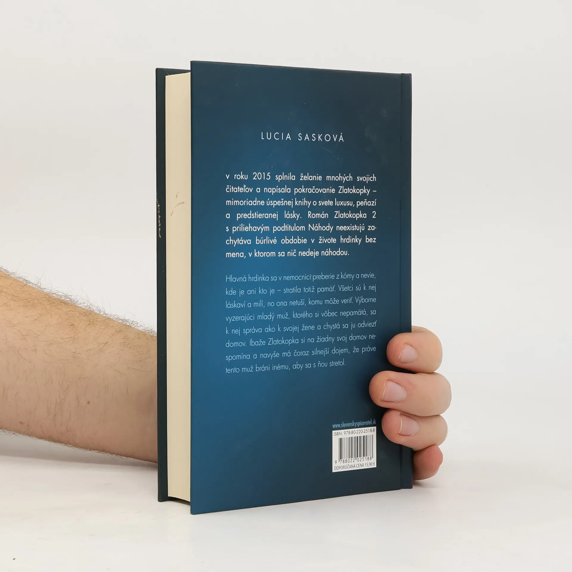 Jedna z najočakávanejších kníh tohto roku. Autorka Lucia Sasková ňou nadväzuje na svoj najúspešnejší román spred dvoch rokov. Zlatokopka sa v nemocnici preberie z kómy a nevie, kde je ani kto je. Všetci sú k nej láskaví a milí, zdá sa jej však, že ju strážia. Výborne vyzerajúci mladý muž, ktorého si vôbec nepamätá, sa k nej správa ako k svojej žene a chystá sa ju odviezť domov. Ibaže Zlatokopka si na žiadny svoj domov nespomína a navyše má dojem, že práve tento muž bráni inému sa s ňou stretnúť...Priazni čitateľov sa tešia aj Luciine ďalšie dve knihy – Neznámych nemiluj a Nebezpečná. Rodená Žilinčanka žije v Nitre a voľný čas venuje dvojnohým a štvornohým priateľom a priateľkám a písaniu.