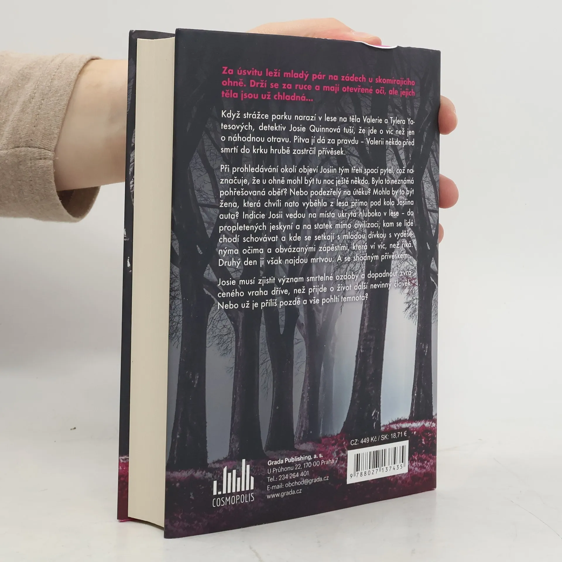 Za úsvitu leží mladý pár na zádech u skomírajícího ohně. Drží se za ruce a mají otevřené oči, ale jejich těla jsou už chladná...Když strážce parku narazí v lese na těla Valerie a Tylera Yatesových, detektiv Josie Quinnová tuší, že jde o víc než jen o náhodnou otravu. Pitva jí dá za pravdu – Valerii někdo před smrtí do krku hrubě zastrčil přívěsek.Při prohledávání okolí objeví Josiin tým třetí spací pytel, což naznačuje, že u ohně mohl být tu noc ještě někdo. Byla to neznámá pohřešovaná oběť? Nebo podezřelý na útěku? Mohla by to být žena, která chvíli nato vyběhla z lesa přímo pod kola Josiina auta? Indicie Josii vedou na místa ukrytá hluboko v lese – do propletených jeskyní a na statek mimo civilizaci, kam se lidé chodí schovávat a kde se setkají s mladou dívkou s vyděšenýma očima a obvázanými zápěstími, která ví víc, než říká. Druhý den ji však najdou mrtvou. A se shodným přívěskemJosie musí zjistit význam smrtelné ozdoby a dopadnout zvráceného vraha dříve, než přijde o život další nevinný člověk. Nebo už je příliš pozdě a vše pohltí temnota?