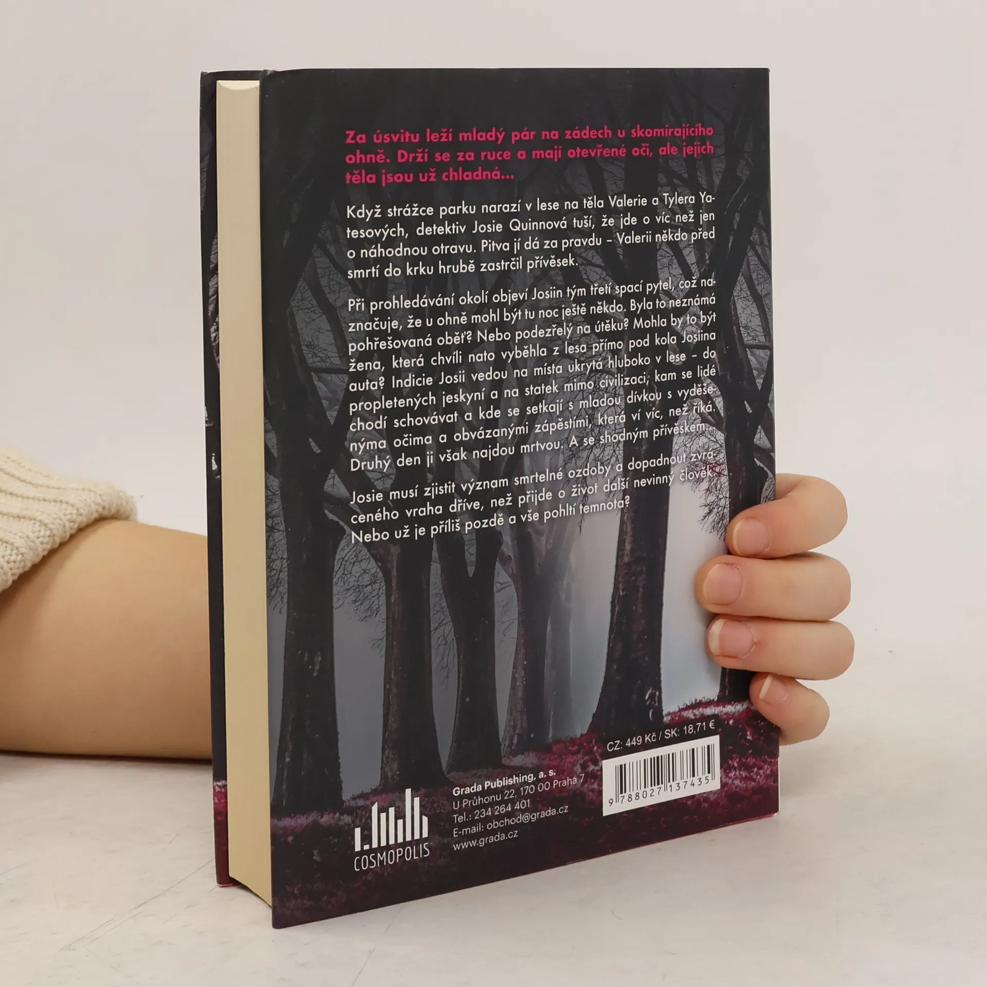 Za úsvitu leží mladý pár na zádech u skomírajícího ohně. Drží se za ruce a mají otevřené oči, ale jejich těla jsou už chladná...Když strážce parku narazí v lese na těla Valerie a Tylera Yatesových, detektiv Josie Quinnová tuší, že jde o víc než jen o náhodnou otravu. Pitva jí dá za pravdu – Valerii někdo před smrtí do krku hrubě zastrčil přívěsek.Při prohledávání okolí objeví Josiin tým třetí spací pytel, což naznačuje, že u ohně mohl být tu noc ještě někdo. Byla to neznámá pohřešovaná oběť? Nebo podezřelý na útěku? Mohla by to být žena, která chvíli nato vyběhla z lesa přímo pod kola Josiina auta? Indicie Josii vedou na místa ukrytá hluboko v lese – do propletených jeskyní a na statek mimo civilizaci, kam se lidé chodí schovávat a kde se setkají s mladou dívkou s vyděšenýma očima a obvázanými zápěstími, která ví víc, než říká. Druhý den ji však najdou mrtvou. A se shodným přívěskemJosie musí zjistit význam smrtelné ozdoby a dopadnout zvráceného vraha dříve, než přijde o život další nevinný člověk. Nebo už je příliš pozdě a vše pohltí temnota?