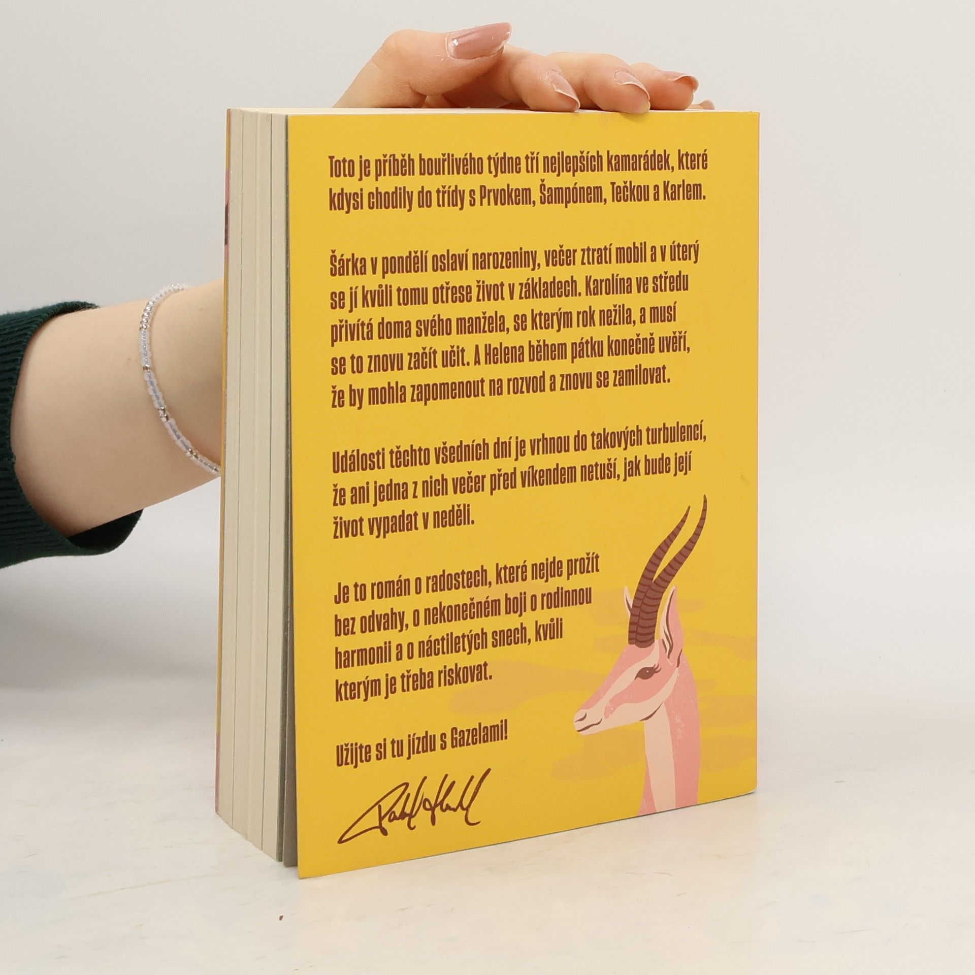Gazely vypráví příběh jednoho bouřlivého týdne tří blízkých kamarádek, které kdysi chodily do školy s Prvokem, Šampónem, Tečkou a Karlem. Šárka začíná týden narozeninovou oslavou, ale ztráta mobilu jí už v úterý převrátí život naruby. Karolína se ve středu setkává se svým manželem, se kterým po roce odloučení zkouší obnovit vztah. Helena v pátek zjišťuje, že by mohla nechat rozvod za sebou a znovu najít lásku. Během těchto několika dní se jejich životy ocitnou ve víru změn, takže ani jedna z nich nemá tušení, jaké překvapení je čeká do neděle. Tento román je o radosti, která vyžaduje odvahu, o neustálém úsilí najít rovnováhu v rodině a o snech z mládí, kvůli kterým stojí za to riskovat.