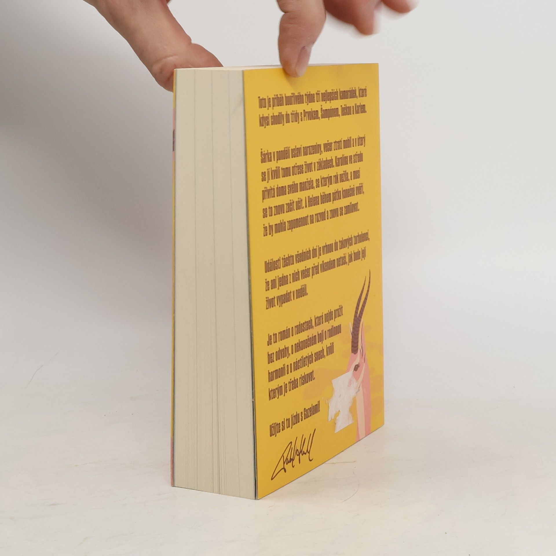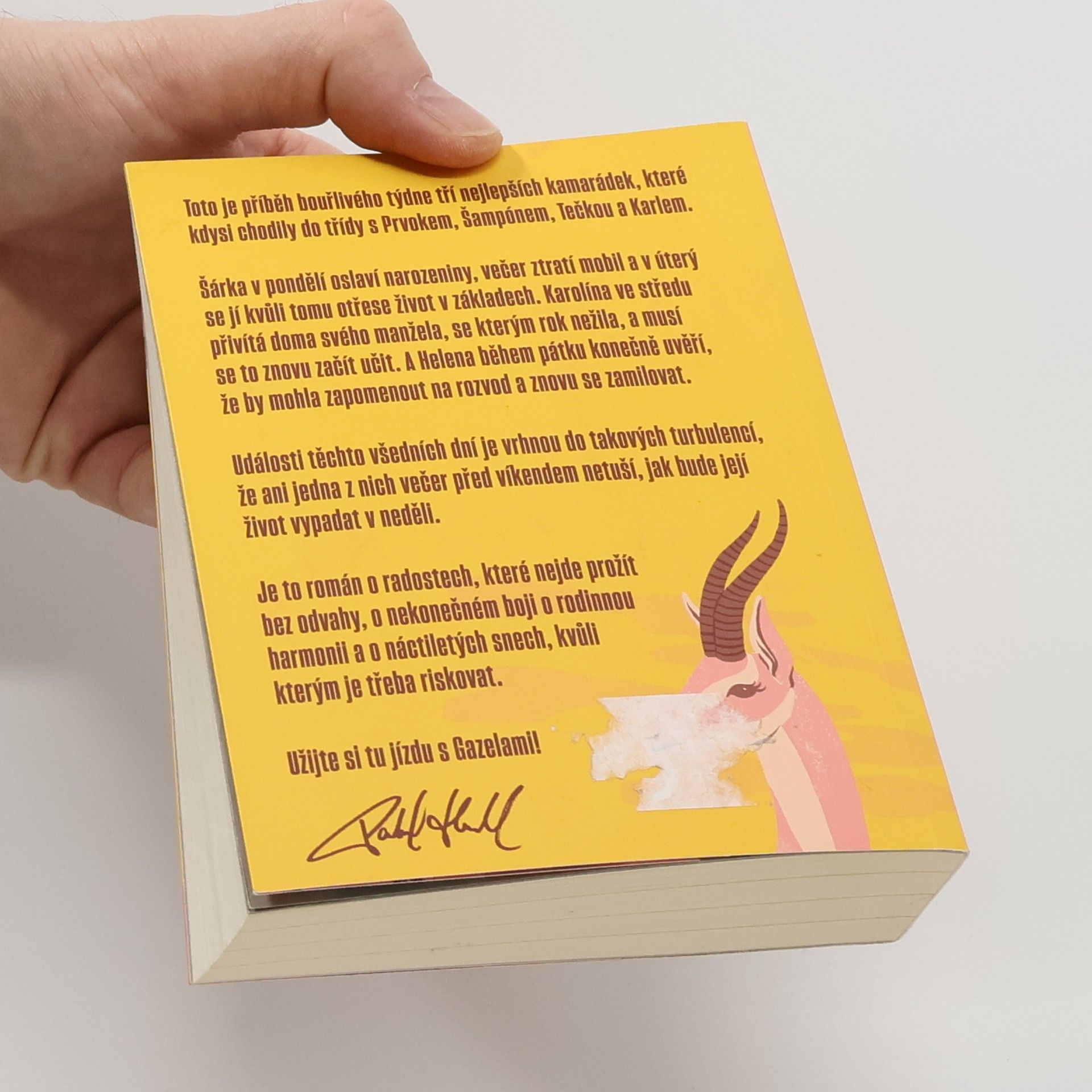 Gazely vypráví příběh jednoho bouřlivého týdne tří blízkých kamarádek, které kdysi chodily do školy s Prvokem, Šampónem, Tečkou a Karlem. Šárka začíná týden narozeninovou oslavou, ale ztráta mobilu jí už v úterý převrátí život naruby. Karolína se ve středu setkává se svým manželem, se kterým po roce odloučení zkouší obnovit vztah. Helena v pátek zjišťuje, že by mohla nechat rozvod za sebou a znovu najít lásku. Během těchto několika dní se jejich životy ocitnou ve víru změn, takže ani jedna z nich nemá tušení, jaké překvapení je čeká do neděle. Tento román je o radosti, která vyžaduje odvahu, o neustálém úsilí najít rovnováhu v rodině a o snech z mládí, kvůli kterým stojí za to riskovat.