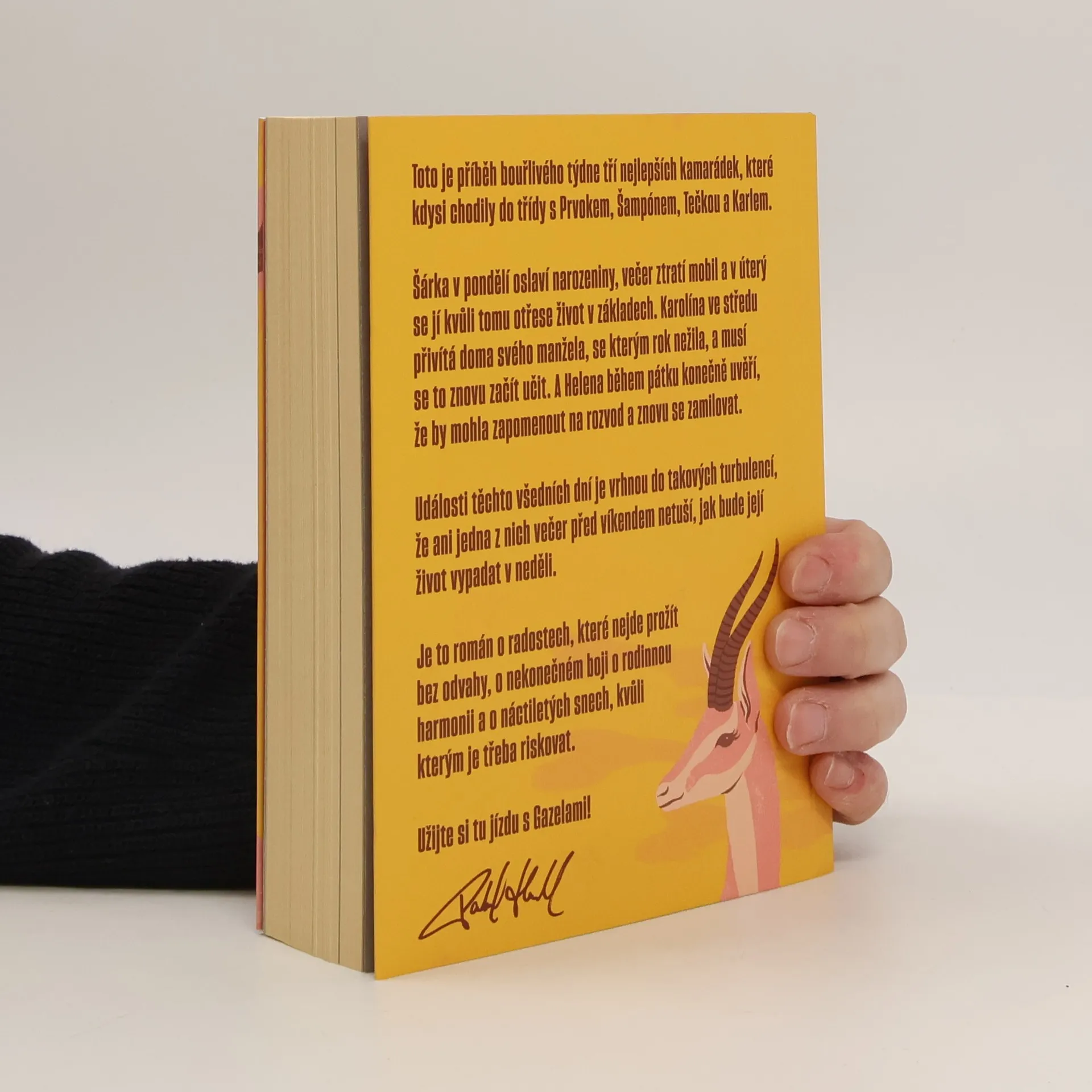 Gazely vypráví příběh jednoho bouřlivého týdne tří blízkých kamarádek, které kdysi chodily do školy s Prvokem, Šampónem, Tečkou a Karlem. Šárka začíná týden narozeninovou oslavou, ale ztráta mobilu jí už v úterý převrátí život naruby. Karolína se ve středu setkává se svým manželem, se kterým po roce odloučení zkouší obnovit vztah. Helena v pátek zjišťuje, že by mohla nechat rozvod za sebou a znovu najít lásku. Během těchto několika dní se jejich životy ocitnou ve víru změn, takže ani jedna z nich nemá tušení, jaké překvapení je čeká do neděle. Tento román je o radosti, která vyžaduje odvahu, o neustálém úsilí najít rovnováhu v rodině a o snech z mládí, kvůli kterým stojí za to riskovat.