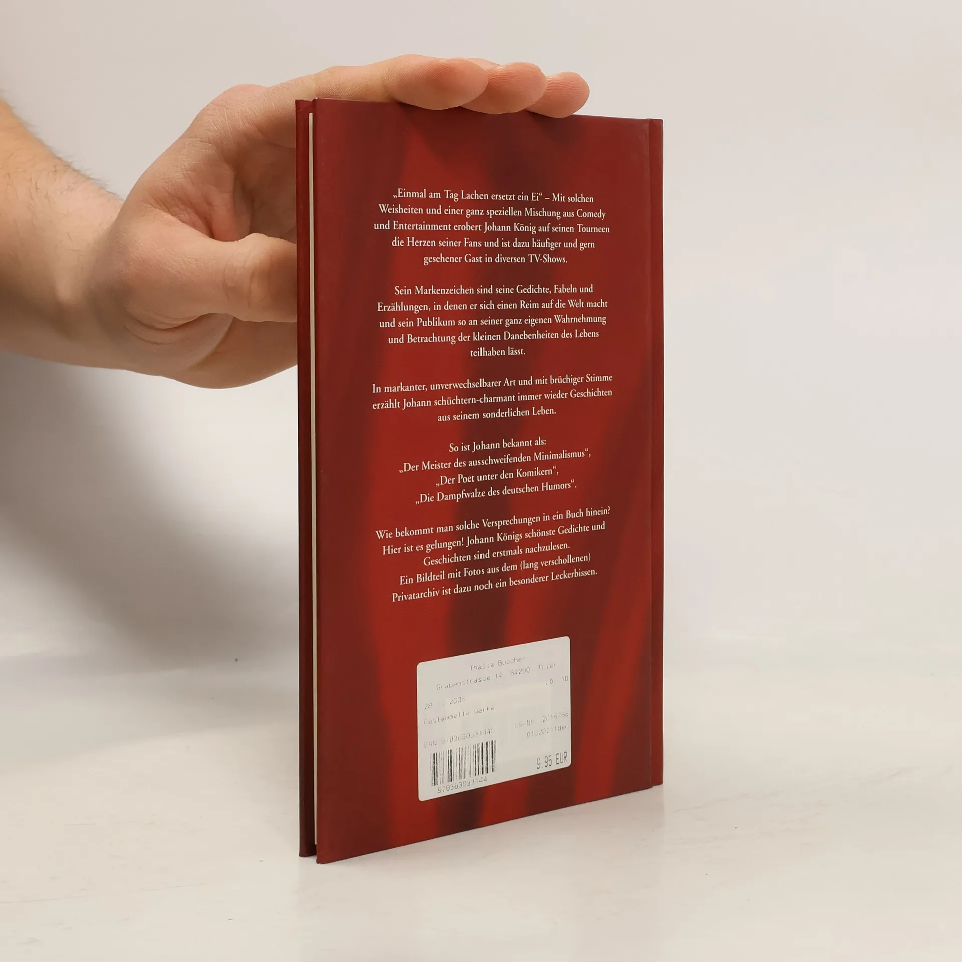 „Einmal am Tag Lachen ersetzt ein Ei“ – Mit solchen Weisheiten und einer ganz speziellen Mischung aus Comedy und Entertainment erobert Johann König auf seinen Tourneen die Herzen seiner Fans und ist dazu häufiger und gern gesehener Gast in diversen TV-Shows. Sein Markenzeichen sind seine Gedichte, Fabeln und Erzählungen, in denen er sich einen Reim auf die Welt macht und sein Publikum so an seiner ganz eigenen Wahrnehmung und Betrachtung der kleinen Danebenheiten des Lebens teilhaben lässt. In markanter, unverwechselbarer Art und mit brüchiger Stimme erzählt Johann schüchtern-charmant immer wieder Geschichten aus seinem Leben. So ist Johann bekannt als: „Der Meister des ausschweifenden Minimalismus“, „Der Poet unter den Komikern“, „Die Dampfwalze des deutschen Humors“. Wie bekommt man solche Versprechungen in ein Buch hinein? Hier ist es gelungen! Johann Königs schönste Gedichte und Geschichten sind erstmals nachzulesen. Ein Bildteil mit Fotos aus dem (lang verschollenen) Privatarchiv ist dazu noch ein besonderer Leckerbissen.