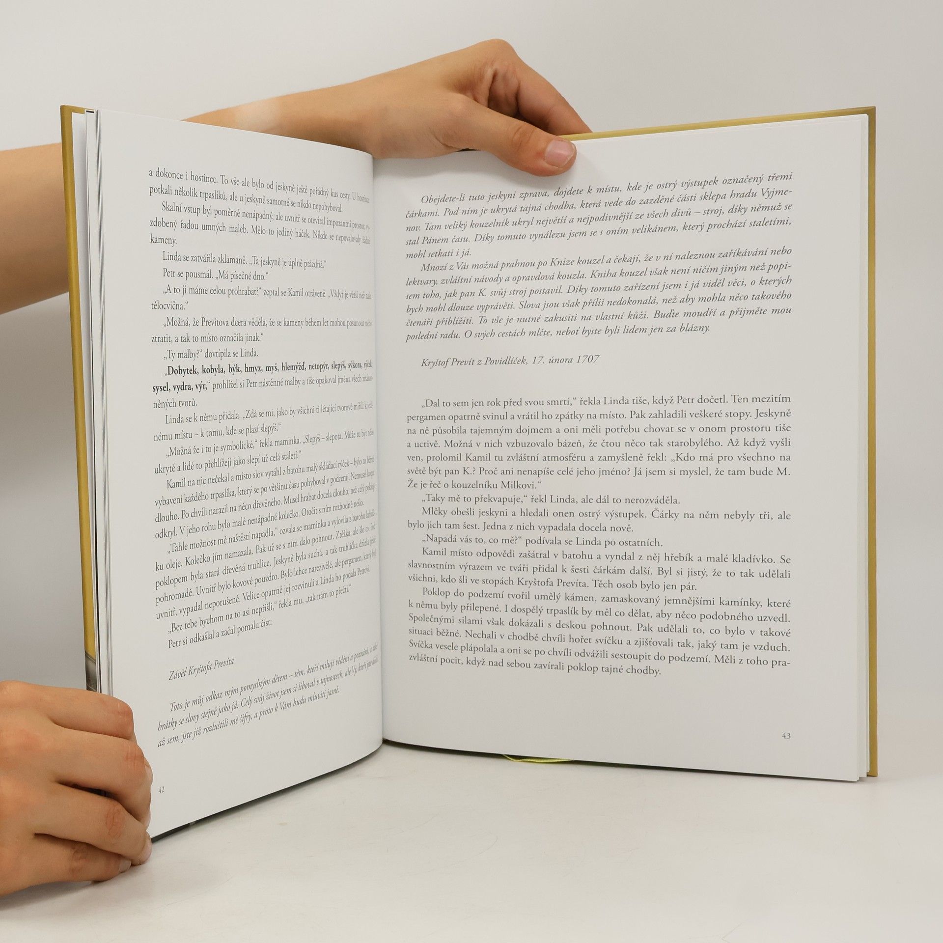 Vyjmenovaná slova jsou ve skutečnosti tajná šifra. Trpasličí holka Linda a její bratranec Kamil se pokusí rozluštit, co tou tajnou šifrou slavný vědec, vynálezce a umělec Kryštof Prevít z Povidliček a Satelitů chtěl sdělit. Asi jste se je vždy učili jinak, ale jakmile Linda uslyší seznam vyjmenovaných zvířat, dojde této desetileté dívce něco, co většina dospělých přehlíží - všechna ta zvířata jsou přece znázorněná ve známé jeskyni Altemirka. Odtud už je to jen kousek k rozluštění Prevítova tajemného poselství. Je možné, že něco podobného napadlo i Lindina tatínka, který se před dvěma roky ztratil? Podaří se jí ho ještě někdy najít? Nakladatelská anotace. Kráceno.