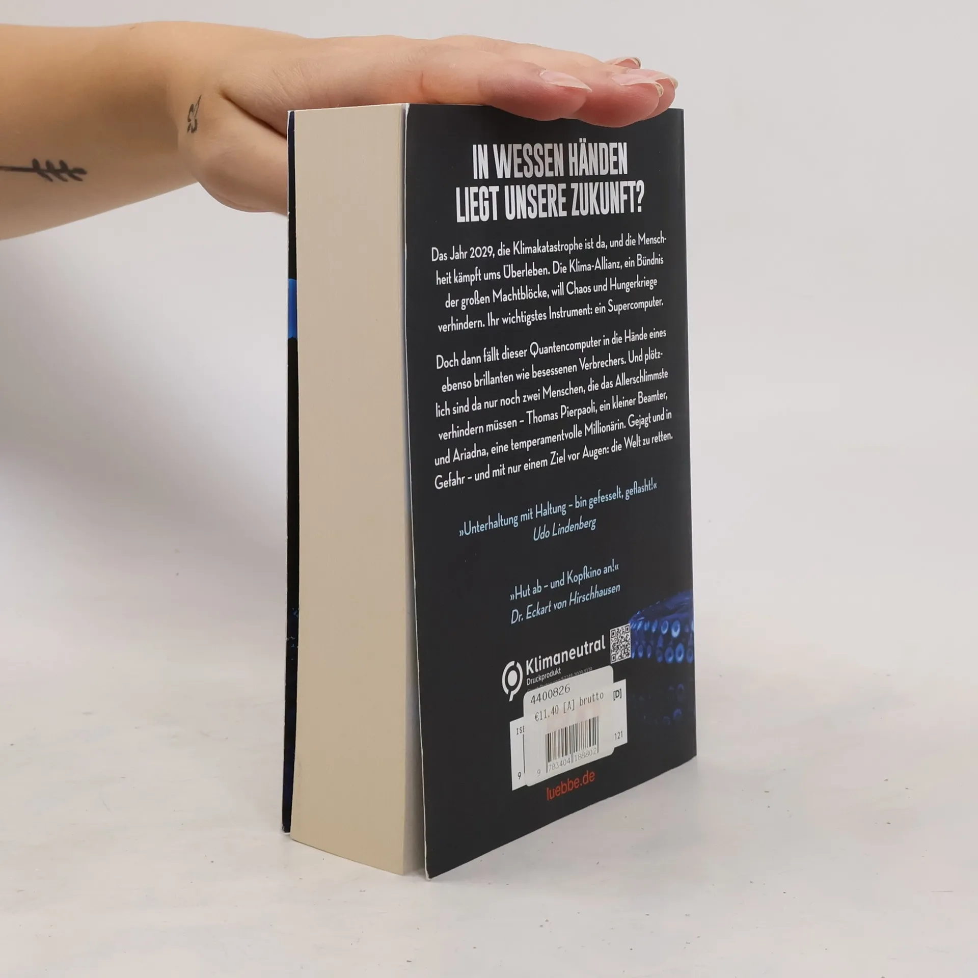 Das Jahr 2029, die Klimakatastrophe ist da, und die Menschheit kämpft ums Überleben. Die Klima-Allianz, ein Bündnis der großen Machtblöcke, will Chaos und Hungerkriege verhindern. Ihr wichtigstes Instrument: ein Supercomputer. Doch dann fällt dieser Quantencomputer in die Hände eines ebenso brillanten wie besessenen Verbrechers. Und plötzlich sind da nur noch zwei Menschen, die das Allerschlimmste verhindern müssen - Thomas Pierpaoli, ein kleiner Beamter, und Ariadna, eine temperamentvolle Millionärin. Gejagt und in Gefahr - und mit nur einem Ziel vor Augen: die Welt zu retten.