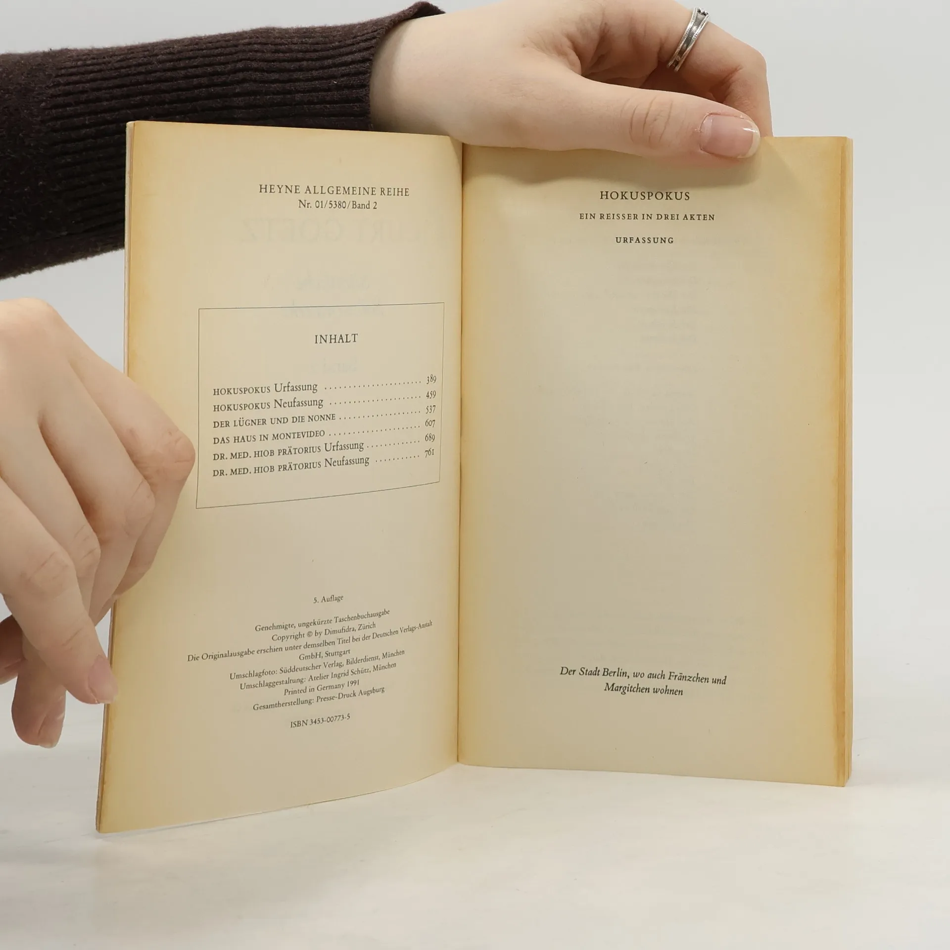 enthält die Bühnenwerke Hokuspokus (Urfassung/Neufassung), Der Lügner und die Nonne, Das Haus in Montevideo, Dr. med. Hiob Prätorius (Urfassung/Neufassung)