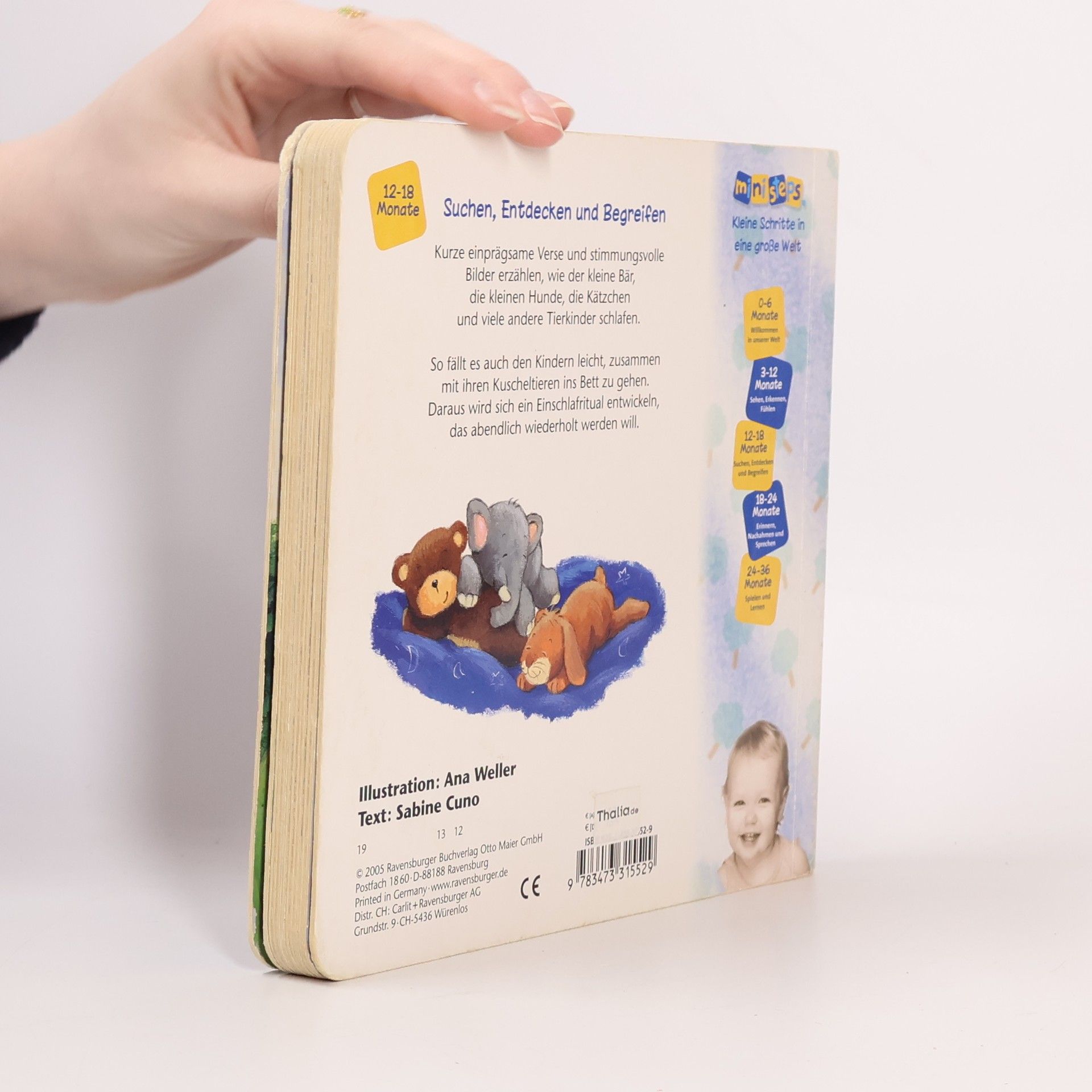 Ein Lieblings-Gutenacht-Buch für die Kleinsten! Liebevolle Gute-Nacht-Szenen zeigen, wie der kleine Bär, die kleinen Hunde und viele andere Tierkinder schlafen gehen. Zweiundzwanzig stimmungsvolle Bilder begleiten die Geschichten. Kurze emotionale Reime animieren zum Mitsprechen und sind ein ideales Ritual für Kinder, sodass es ihnen leichtfällt, ins Bett zu gehen. Diese besondere Geschichte bietet ein wunderschönes Einschlafritual und sollte in keinem Kinderzimmer fehlen. Die Bären schlafen in ihrer Höhle, die Schnecke zieht sich in ihr Haus zurück, und die Hundekinder kuscheln sich aneinander. Wie schlafen Igelkinder, Löwenbabys und kleine Pinguine? Fast 20 verschiedene Tierkinder werden liebevoll zu Bett gebracht. Die stimmungsvollen Bilder zeigen die Tiere und ihre Kinder in ihrem natürlichen Zuhause und bieten viele Gesprächsanlässe für Eltern und Kind. Die Reime führen durch das Buch, bis auch das Kind mit seinen Kuscheltieren schlafen geht. So wird das Einschlafen kinderleicht. - Unterstützt das Einschlafritual - Reime fördern die Sprachentwicklung - Mit den Lieblingstieren der Kleinen Vertrauen schenken. ministeps begleitet Babys und Kleinkinder auf ihren ersten Schritten ins Leben. Die vielfältigen ministeps Produkte bieten optimale Sinnesanreize, fördern das Erkennen von Farben, Formen und Bildern und ermutigen zum Krabbeln und Sprechen. Alle Produkte sind von höchster Ravensburger Qualität.