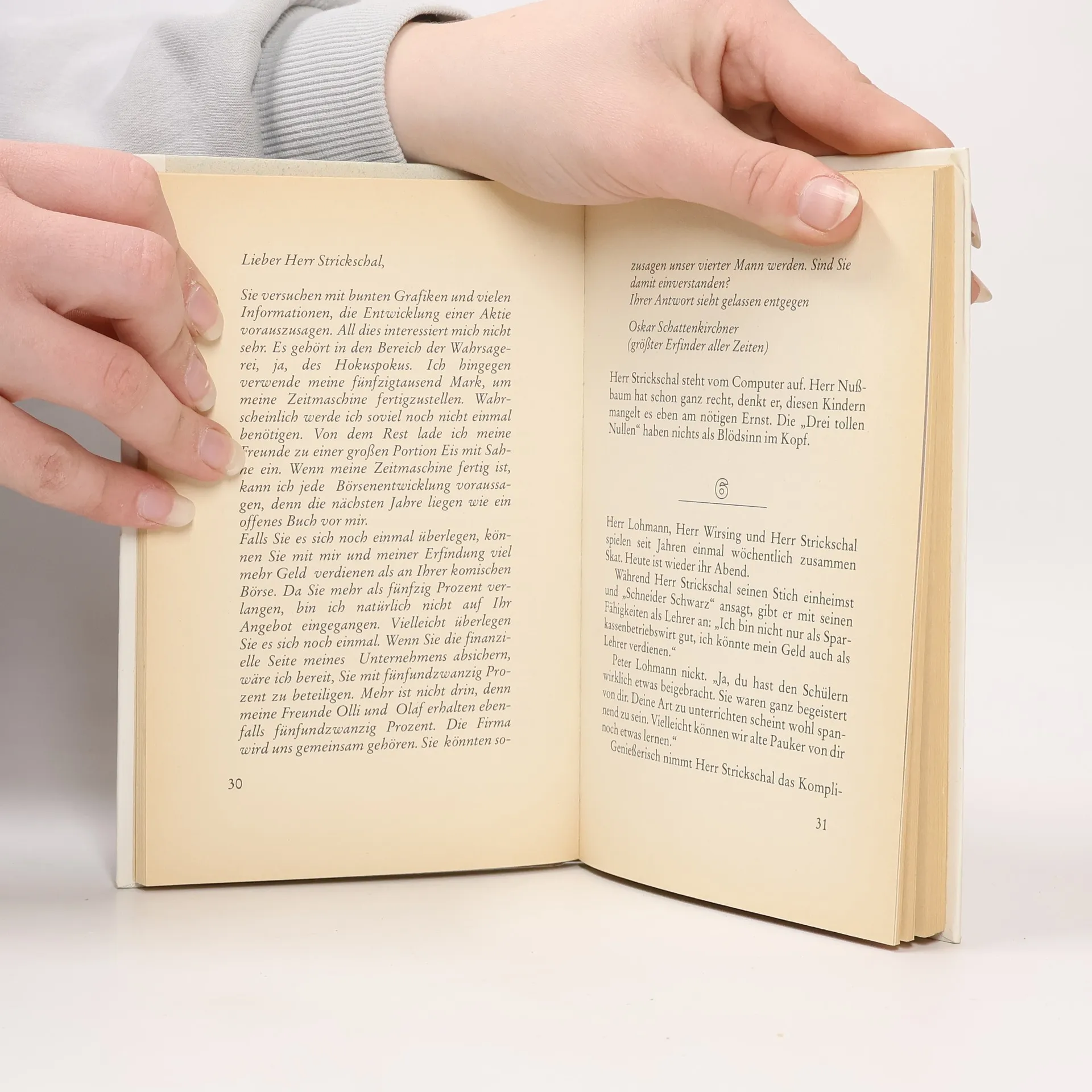 Mit einer selbstgebastelten Zeitmaschine, durch die man in die Zukunft sehen kann, und den angeblich mit ihr ermittelten Börsentips versetzen die "3 tollen Nullen" Eltern, Lehrer, Bankfachleute und Professoren in Erstaunen - und in Börsenfieber. Ollis Tips, die sie in Wirklichkeit mit Wurfpfeilen ermittelt, werden von den begierigen Spekulanten umgehend befolgt, auch wenn sie noch so unwahrscheinlich sind. Es erübrigt sich fast zu sagen, dass sich die Erwachsenen wieder einmal gründlich lächerlich machen, letztlich aber den Kindern für diese Lehre danken und demütig um Diskretion bitten. Wegen der aus den anderen Bänden (s. zuletzt ID 50/90) schon bekannten Einwände - Klischees von dummen Erwachsenen und schlauen "3 Nullen", unglaubwürdige Handlung, nachlässige Sprache - kann ich mich auch hier nicht zu einem anderen Urteil durchringen als: für öffentliche Bibliotheken nicht geeignet