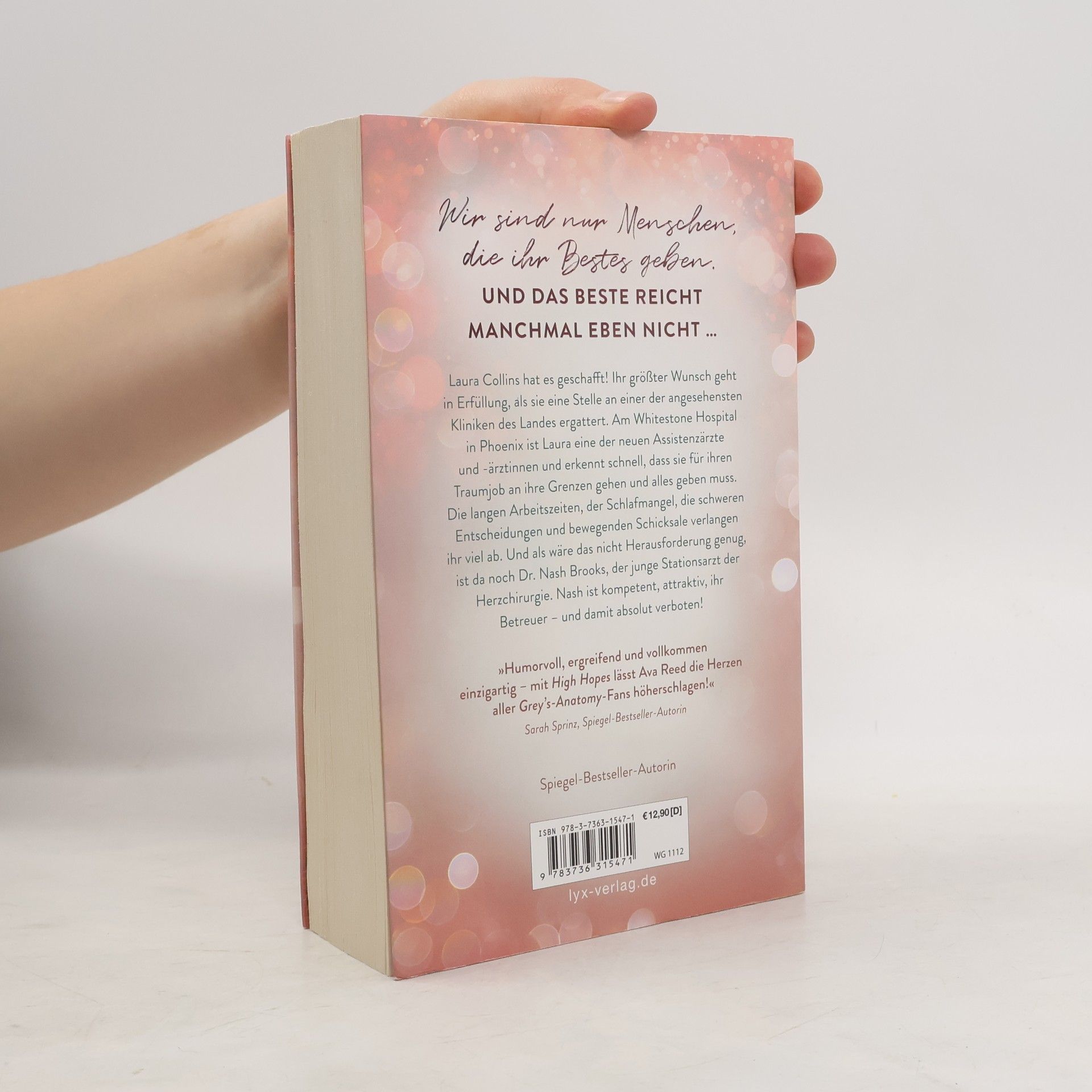 Wir sind nur Menschen, die ihr Bestes geben. Und das Beste reicht manchmal eben nicht ... Laura Collins hat es geschafft! Ihr größter Wunsch geht in Erfüllung, als sie eine Stelle an einer der angesehensten Kliniken des Landes ergattert. Am Whitestone Hospital in Phoenix ist Laura eine der neuen Assistenzärzte und -ärztinnen und erkennt schnell, dass sie für ihren Traumjob an ihre Grenzen gehen und alles geben muss. Die langen Arbeitszeiten, der Schlafmangel, die schweren Entscheidungen und bewegenden Schicksale verlangen ihr viel ab. Und als wäre das nicht Herausforderung genug, ist da noch Dr. Nash Brooks, der junge Stationsarzt der Herzchirurgie. Nash ist kompetent, attraktiv, ihr Betreuer - und damit absolut verboten! „Humorvoll, ergreifend und vollkommen einzigartig - mit HIGH HOPES lässt Ava Reed die Herzen aller GREY‘S-ANATOMY-Fans höherschlagen!“ SARAH SPRINZ, SPIEGEL-Bestseller-Autorin Auftakt der vierbändigen Serie rund um die jungen Ärzt: innen des WHITESTONE HOSPITALS von SPIEGEL-Bestseller-Autorin Ava Reed