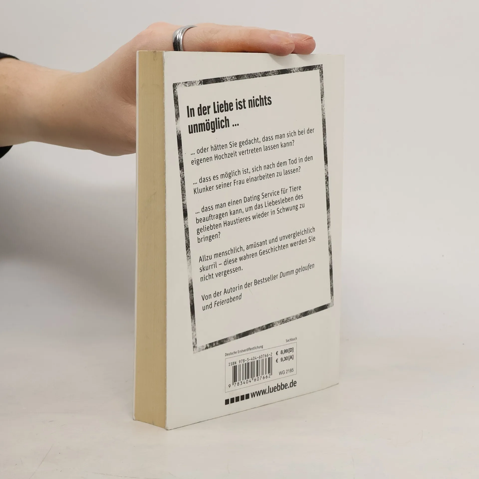 In der Liebe ist nichts unmöglich: Hätten Sie gedacht, dass man sich bei der eigenen Hochzeit vertreten lassen kann? Dass es möglich ist, sich nach dem Tod in den schicken Klunker seiner Frau einarbeiten zu lassen? Oder, dass man einen Dating Service für Tiere beauftragen kann? Es gibt nichts, was es nicht gibt. Dies zeigt Bestsellerautorin Cynthia Ceilán in ihrem neusten Buch mit vielen ungewöhnlichen, skurrilen und komischen Geschichten rund um das Thema Liebe.