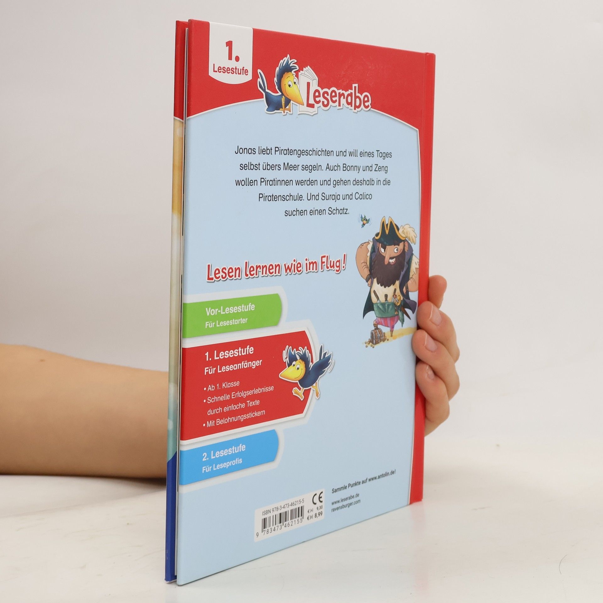 Lesen lernen wie im Flug! Käpt´n Kante und sein Papagei Klecks haben ein Problem. Sie können ihre erbitterten Rivalen Klops und Hans einfach nicht besiegen. Dafür braucht es schon eine besondere Seeräuber-Taktik. Suraja und Calico haben ein anderes Problem. Sie suchen auf einer einsamen Insel einen Schatz, den ihr Piraten-Papa versteckt hat - leider hat er vergessen, wo. Bonny und Zeng lernen auf dem Schulschiff der Piraten alles übers Entern. Ganz im Gegensatz zu Jonas, der gern ein Pirat wäre, aber Bäcker werden soll. Lesen lernen wie im Flug! Die Kinderbücher der Reihe Leserabe – 1. Lesestufe wurden mit Pädagogen entwickelt und richten sich an Leseanfänger ab der 1. Klasse. Kurze Texte in großer Fibelschrift sichern erste Leseerfolge und steigern die Lesekompetenz von Mädchen und Jungen ab 6 Jahren. Mit Belohnungsstickern. Empfohlen von Stiftung Lesen, gelistet bei Antolin.