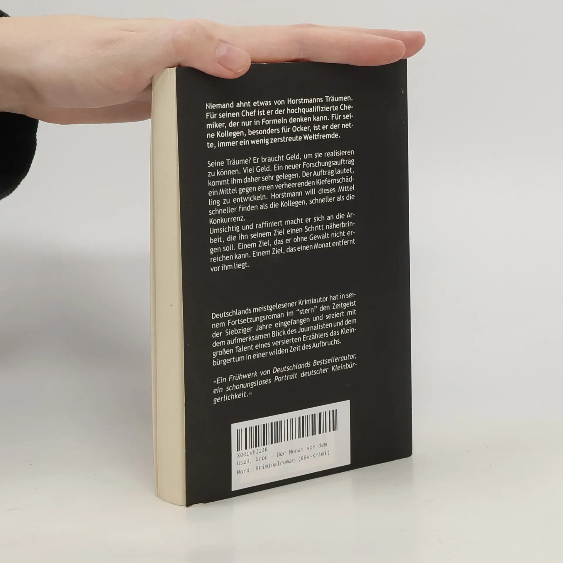 Nicht immer steht die Tat am Anfang Niemand ahnt etwas von Horstmanns Träumen. Für seinen Chef ist er der hochqualifizierte Chemiker, der nur in Formeln denken kann. Für seine Kollegen, besonders für Ocker, ist er der nette, immer ein wenig zerstreute Weltfremde. Seine Träume? Er braucht Geld, um sie realisieren zu können. Viel Geld. Ein neuer Forschungsauftrag kommt ihm daher sehr gelegen. Der Auftrag lautet, ein Mittel gegen einen verheerenden Kiefernschädling zu entwickeln. Horstmann will dieses Mittel schneller finden als die Kollegen, schneller als die Konkurrenz. Umsichtig und raffiniert macht er sich an die Arbeit, die ihn seinem Ziel einen Schritt näherbringen soll. Einem Ziel, das er ohne Gewalt nicht erreichen kann. Einem Ziel, das einen Monat entfernt vor ihm liegt. Deutschlands meistgelesener Krimiautor hat in seinem Fortsetzungsroman im „stern“ den Zeitgeist der Siebziger Jahre eingefangen uns seziert mit dem aufmerksamen Blick des Journalisten und dem großen Talent eines versierten Erzählers das Kleinbürgertum in einer wilden Zeit des Aufbruchs.