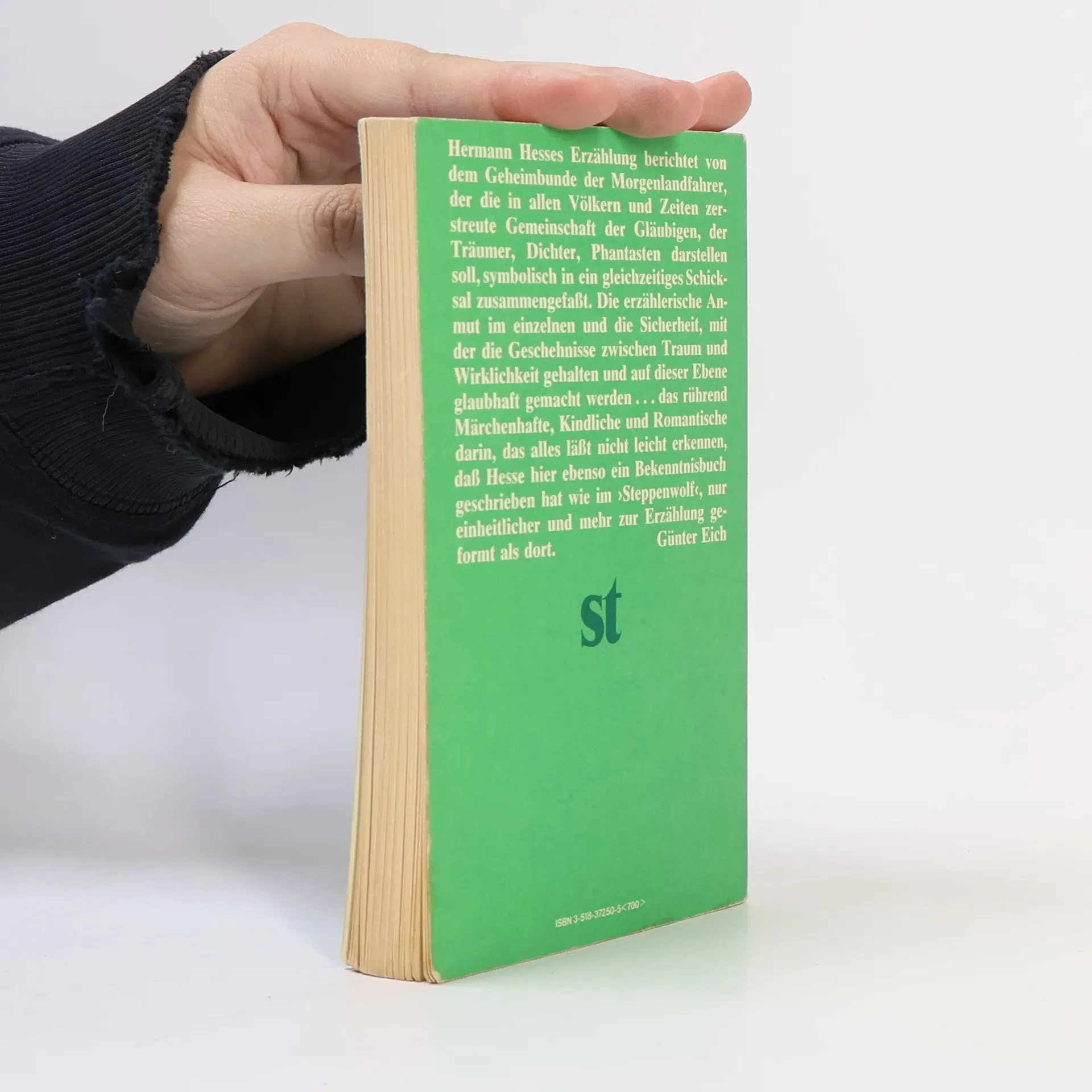 Hermann Hesses Erzählung berichtet von dem Geheimbunde der Morgenlandfahrer, der die in allen Völkern und Zeiten zerstreute Gemeinschaft der Gläubigen, der Träumer, Dichter, Phantasten darstellen soll, symbolisch in ein gleichzeitiges Schicksal zusammenfaßt. Günter Eich