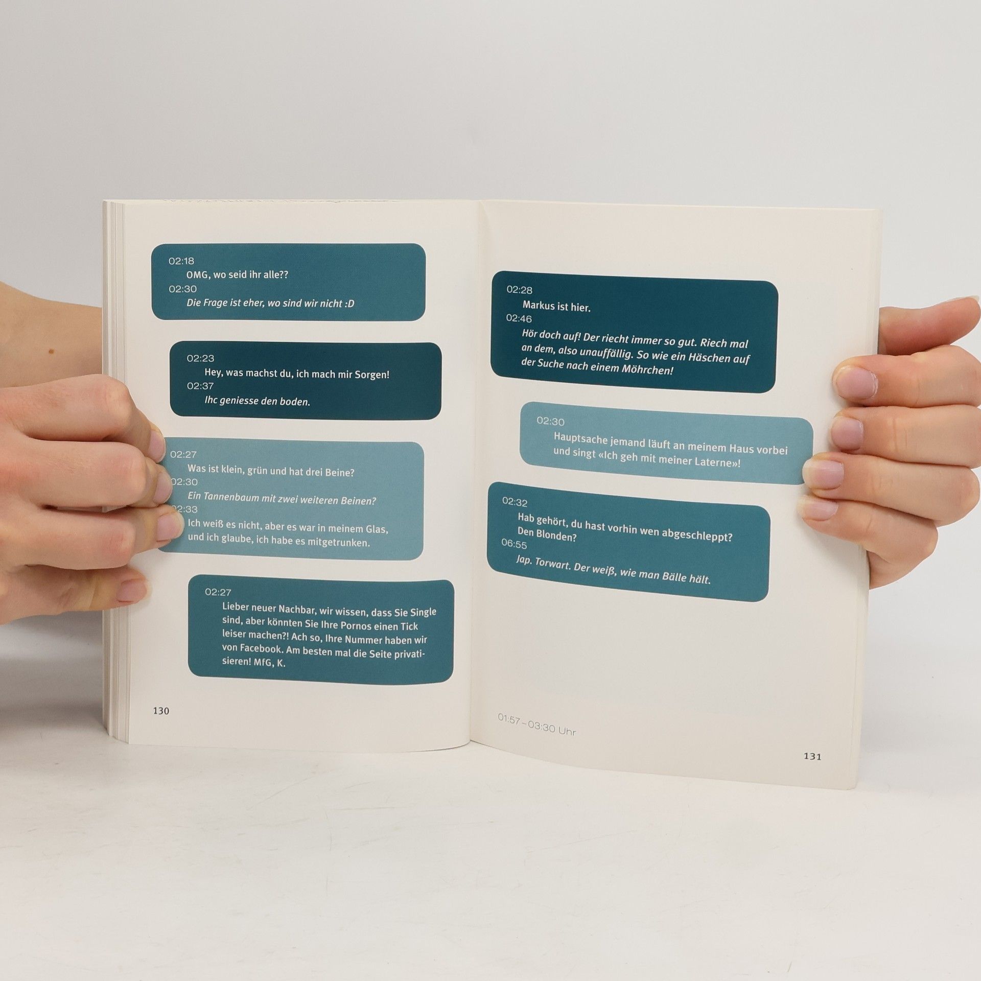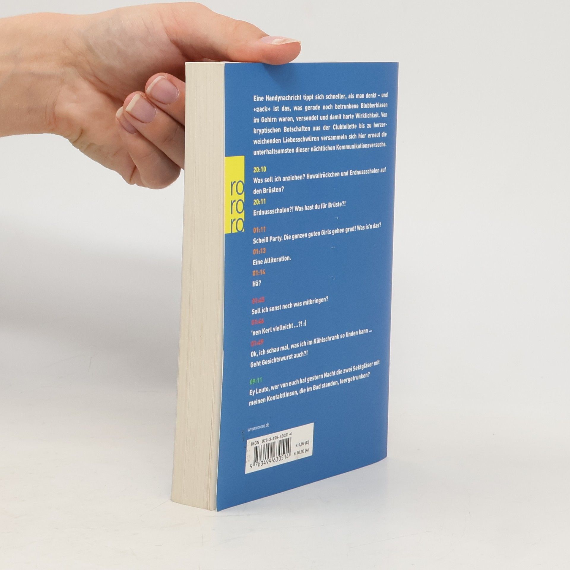 Eine Handynachricht tippt sich schneller, als man denkt – und «zack» ist das, was gerade noch betrunkene Blubberblasen im Gehirn waren, versendet und damit harte Wirklichkeit. Von kryptischen Botschaften aus der Clubtoilette bis zu herzerweichenden Liebesschwüren versammeln sich hier die unterhaltsamsten nächtlichen Kommunikationsversuche. „Was soll ich anziehen? Hawaiiröckchen und Erdnussschalen auf den Brüsten?“ „Erdnussschalen?! Was hast du für Brüste?!“ „Scheiß Party. Die ganzen guten Girls gehen grad! Was is’n das?“ „Eine Alliteration.“ „Hä?“ „Soll ich sonst noch was mitbringen?“ „’nen Kerl vielleicht ...?! :)“ „Ok, ich schau mal, was ich im Kühlschrank so finden kann ... Geht Gesichtswurst auch?!“ „Ey Leute, wer von euch hat gestern Nacht die zwei Sektgläser mit meinen Kontaktlinsen, die im Bad standen, leergetrunken?“