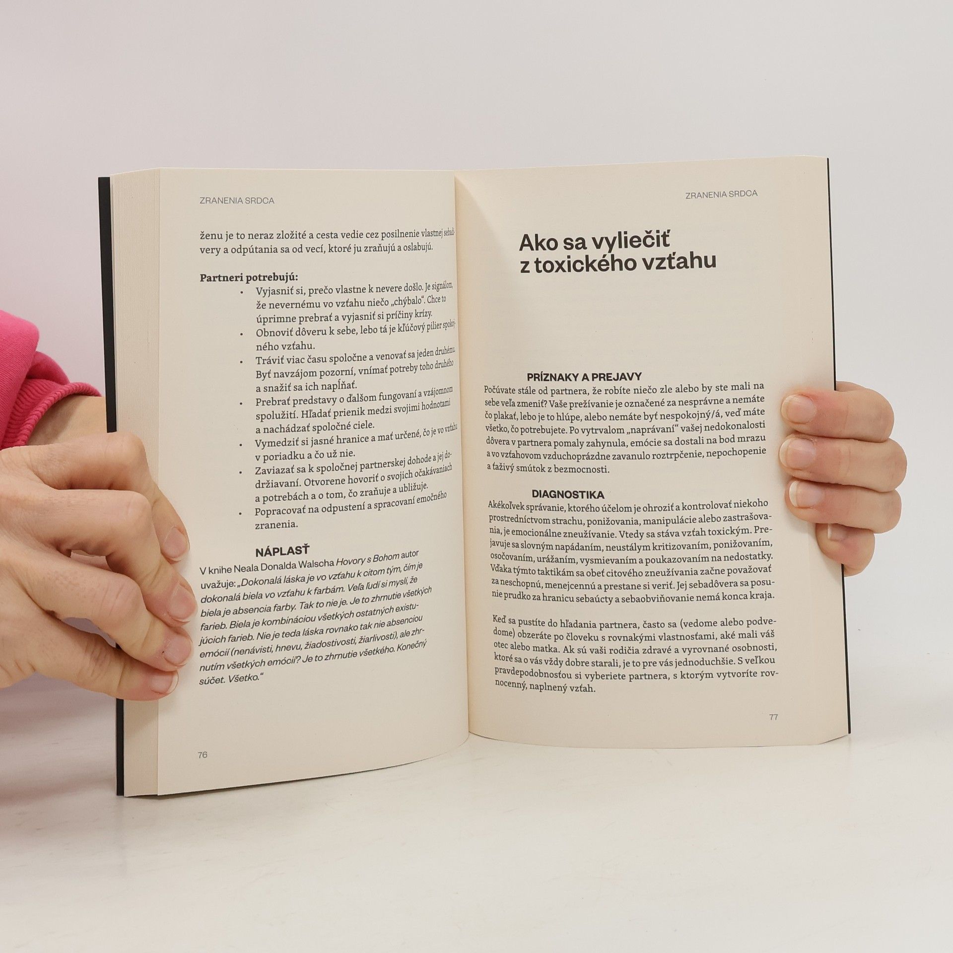 Knihu tvoria opisné postupy ponúkajúce možnosti, čo robiť v krízových situáciách, keď je emočnej a stresovej záťaže príliš veľa a zasahuje do kvality života a integrity človeka. Kapitoly sú tematicky rozdelené podľa emočných a mentálnych „sústav“ (zranenia duše, srdca, ducha, ega aintegrity). Ponúkajú návody, ako bezpečne a svojpomocne zvládnuť okolnosti, ktoré si vyžadujú kontinuálnu starostlivosť o vlastné duševné zdravie. Slúžia ako bezprostredná pomoc na získanie odstupu od problémov, pre ktoré človek prichádza o emočnú vyrovnanosť a stabilitu. Zámerom knihy nie je nahrádzať odbornú psychoterapeutickú pomoc. Svojím obsahom chce prispieť k zníženiu výskytu komplikácií zo zlých a z unáhlených rozhodnutí, neproduktívnych postojov a toxických návykov. Autorka, ktorá pôsobí v oblasti mentálneho zdravia viac než pätnásť rokov, pripravila dvadsaťpäť návodov, ako si pomôcť pri rôznych symptómoch duševných zranení, emočnej bolesti a mentálnej neistoty. Postupy, ako dosahovať duševnú pohodu a rovnováhu, dopĺňa príbehmi zo svojej praxe.