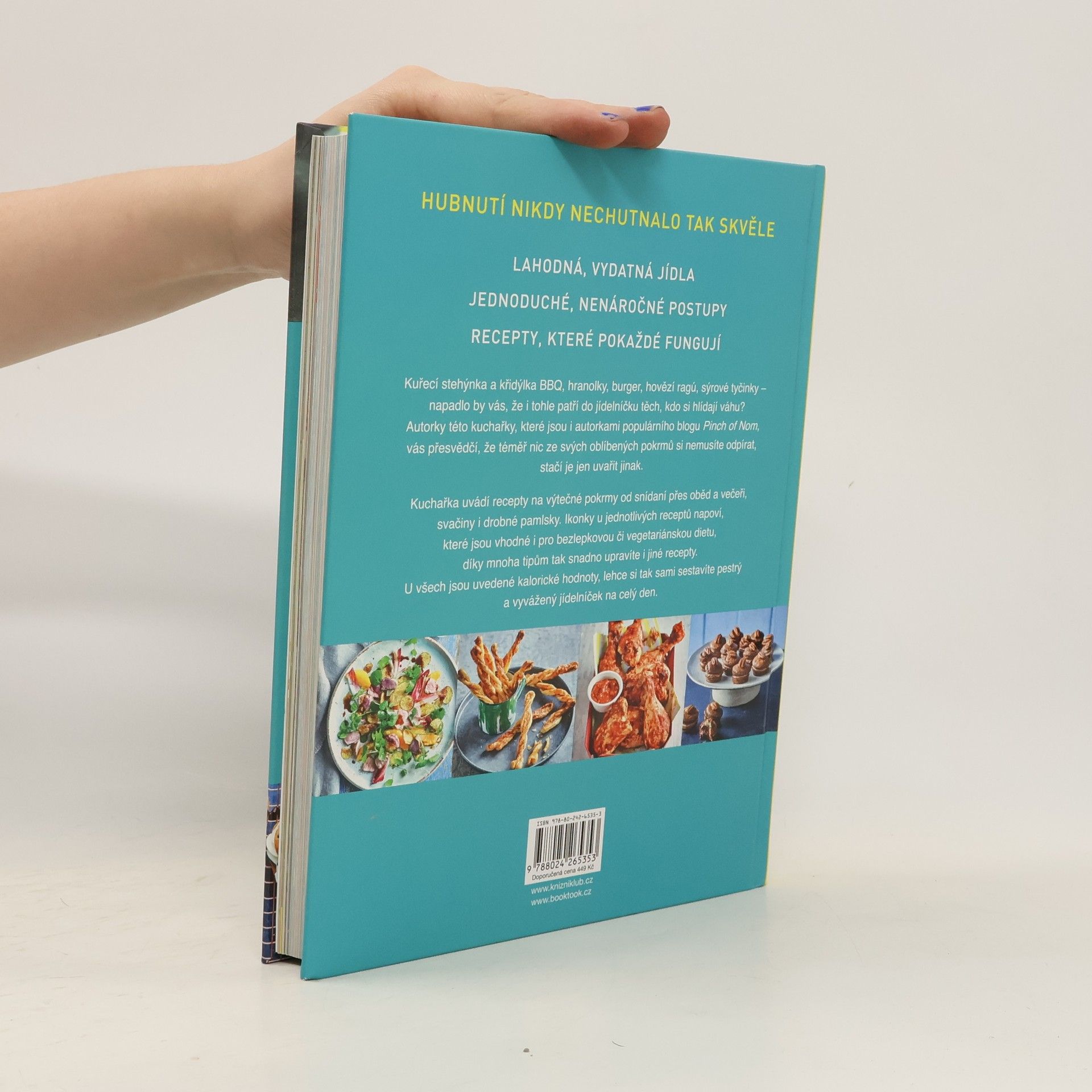 Dietní jídlo, které nikdy nechutnalo tak dobře; kuchařka receptů z nejnavštěvovanějšího britského blogu, kterou musíte mít doma! Kate Allinsonová a Kay Featherstoneová na blogu pinchofnom.com sdílí lahodné recepty, které pomáhají milionům lidí dobře vařit, dobře jíst a přitom hubnout. Kuchařka umožní kuchařům začátečníkům i zkušenějším vychutnat si syté pokrmy plné chutí. Jídla přispívají k hubnutí, jsou přístupná a nevyžadují počítání bodů ani odpírání surovin, přičemž vyhovují populárním dietním programům. Obsahuje sto skvělých receptů, z nichž třicet tři jsou vegetariánské. Každý recept je vyzkoušený a otestovaný členy komunity Pinch of Nom, kteří potvrzují, že pokrmy jsou zdravé, chutné a snadné na přípravu. Všechna jídla jsou tak lahodná, že nikdo by nevěřil, jak málo kalorií obsahují. Recepty nejsou doplněné „hodnotami“ jako většina jiných dietních kuchařek; místo toho jsou zde ikonky, které vás dovedou k těm nejvhodnějším, ať už hledáte vegetariánské jídlo, něco na cesty, nebo potřebujete rychlý recept pro čtyřčlennou rodinu. Autorky vlastní restauraci v severozápadní Anglii, kde Kate Allinsonová pracuje jako šéfkuchařka. Pinch of Nom je dnes nejnavštěvovanějším food blogem ve Velké Británii s téměř dvěma miliony sledujících.
