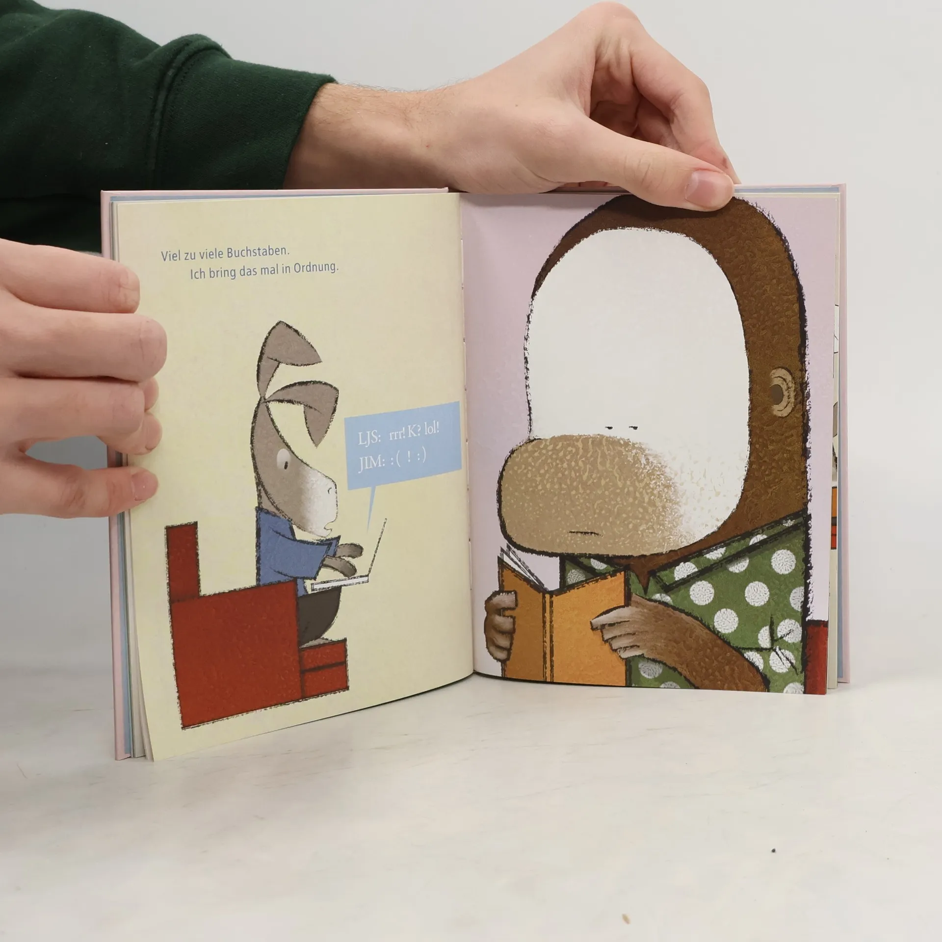Lane Smith erzählt in witzigen Bildern und einfachen Worten die Fabel von der Wiederentdeckung des Buches durch einen Esel, einen Affen und eine Maus. Das Buch ist ein ideales Geschenk für alle, die das Blättern dem Scrollen vorziehen.