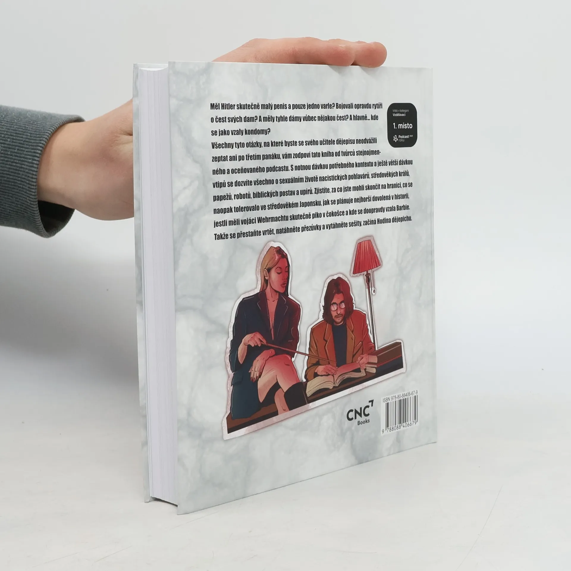 Měl Hitler skutečně malý penis a pouze jedno varle? Bojovali opravdu rytíři o čest svých dam? A měly tyhle dámy vůbec nějakou čest? A hlavně… kde se jako vzaly kondomy? Všechny tyto otázky, na které byste se svého učitele dějepisu neodvážili zeptat ani po třetím panáku, vám zodpoví tato kniha od tvůrců stejnojmenného a oceňovaného podcastu. S notnou dávkou potřebného kontextu a ještě větší dávkou vtipů se dozvíte všechno o sexuálním životě nacistických pohlavárů, středověkých králů, papežů, robotů, biblických postav a upírů. Zjistíte, za co jste mohli skončit na hranici, co se naopak tolerovalo ve středověkém Japonsku, jak se plánuje nejhorší dovolená v historii, jestli měli vojáci Wehrmachtu skutečně piko v čokošce a kde se doopravdy vzala Barbie. Takže se přestaňte vrtět, natáhněte přezůvky a vytáhněte sešity, začíná Hodina dějepichu.