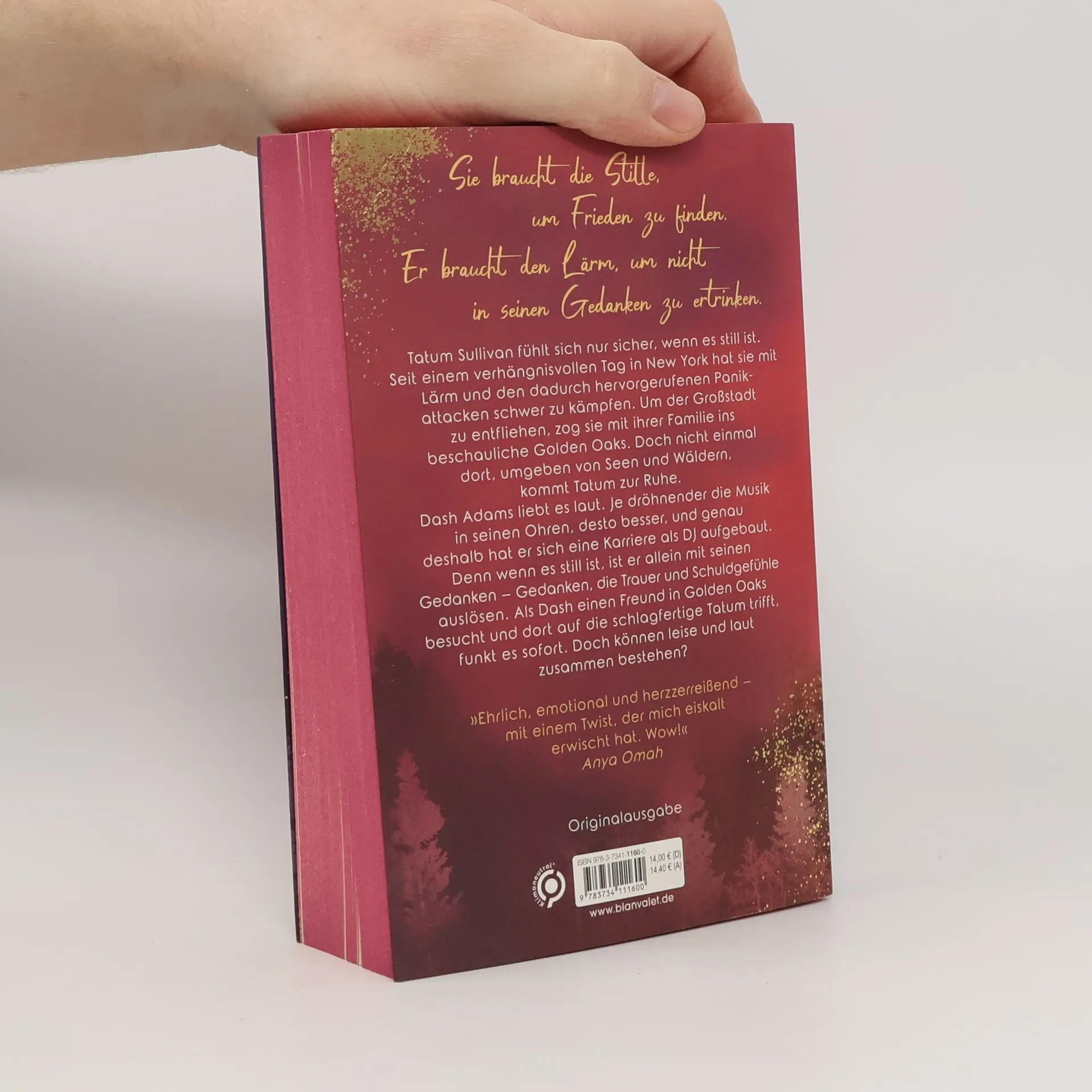 Tatum & Dash: Sie braucht die Stille, um Frieden zu finden. Er braucht den Lärm, um mit seinen Gedanken nicht alleine zu sein. Doch können leise und laut gemeinsam bestehen? Tatum Sullivan fühlt sich nur sicher, wenn es still ist. Seit einem verhängnisvollen Tag in New York hat sie mit Lärm und den dadurch hervorgerufenen Panikattacken schwer zu kämpfen. Um der lauten Großstadt zu entfliehen, zog sie vor einigen Jahren mit ihrer Familie ins beschauliche Golden Oaks, Connecticut. Doch nicht einmal dort, umgeben von Seen und endlosen Wäldern, kommt Tatum zur Ruhe. Dash Adams liebt es laut. Je dröhnender die Musik in seinen Ohren, desto besser, und genau deshalb hat er sich auch eine Karriere als DJ aufgebaut. Denn wenn es still ist, ist er allein mit seinen Gedanken – Gedanken, die Trauer und Schuldgefühle auslösen. Als Dash einen Freund in Golden Oaks besucht und dort auf die schlagfertige Tatum trifft, funkt es sofort. Doch können leise und laut zusammen bestehen? »Ich bin Tatum und Dash hoffnungslos verfallen. Ihre Geschichte ist ehrlich, emotional und herzzerreißend – mit einem Twist, der mich eiskalt erwischt hat. Wow!« Anya Omah