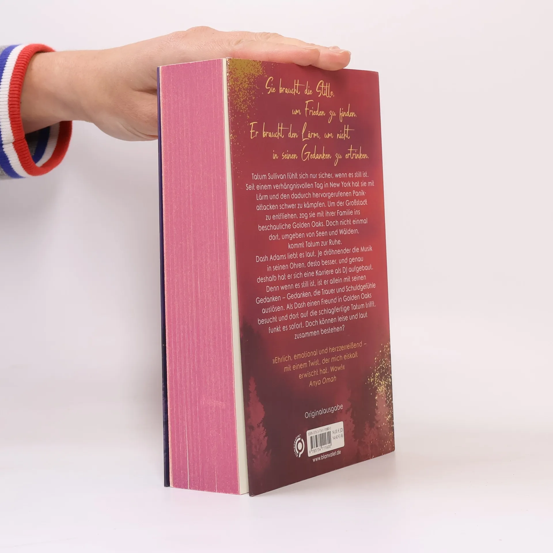 Tatum & Dash: Sie braucht die Stille, um Frieden zu finden. Er braucht den Lärm, um mit seinen Gedanken nicht alleine zu sein. Doch können leise und laut gemeinsam bestehen? Tatum Sullivan fühlt sich nur sicher, wenn es still ist. Seit einem verhängnisvollen Tag in New York hat sie mit Lärm und den dadurch hervorgerufenen Panikattacken schwer zu kämpfen. Um der lauten Großstadt zu entfliehen, zog sie vor einigen Jahren mit ihrer Familie ins beschauliche Golden Oaks, Connecticut. Doch nicht einmal dort, umgeben von Seen und endlosen Wäldern, kommt Tatum zur Ruhe. Dash Adams liebt es laut. Je dröhnender die Musik in seinen Ohren, desto besser, und genau deshalb hat er sich auch eine Karriere als DJ aufgebaut. Denn wenn es still ist, ist er allein mit seinen Gedanken – Gedanken, die Trauer und Schuldgefühle auslösen. Als Dash einen Freund in Golden Oaks besucht und dort auf die schlagfertige Tatum trifft, funkt es sofort. Doch können leise und laut zusammen bestehen? »Ich bin Tatum und Dash hoffnungslos verfallen. Ihre Geschichte ist ehrlich, emotional und herzzerreißend – mit einem Twist, der mich eiskalt erwischt hat. Wow!« Anya Omah