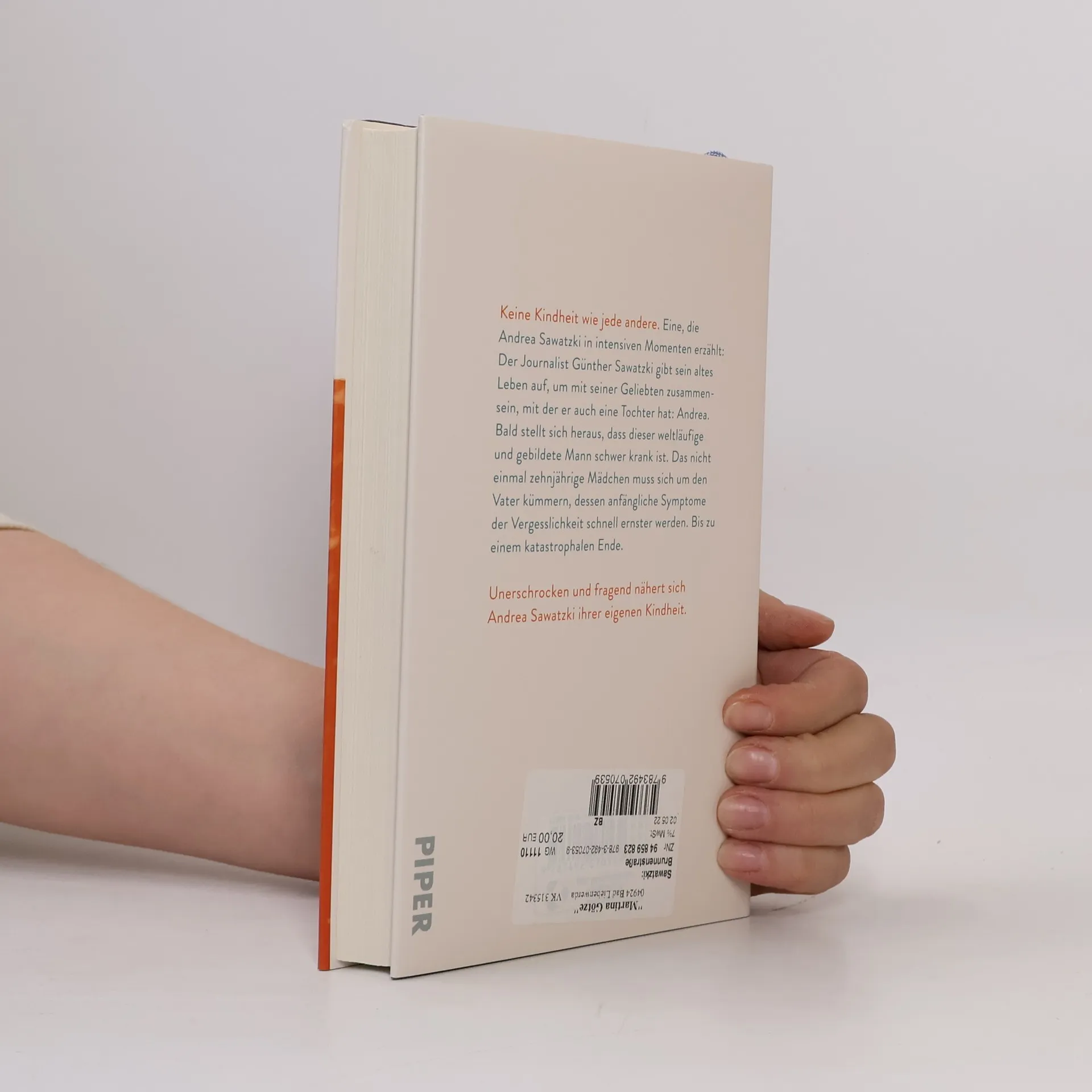 Andrea Sawatzkis ungeschminkter autofiktionaler Roman Keine Kindheit wie jede andere. Eine, die Andrea Sawatzki wie in einem Kurzfilm einfängt: 1971 wird der Journalist Günther Sawatzki von seiner Stelle in London abgezogen und geht zu seiner Familie nach Deutschland zurück. Aber er will sein altes Leben aufgeben und mit seiner Geliebten zusammen sein, mit der er eine Tochter hat: Andrea. Doch bald stellt sich heraus, dass dieser weltläufige und gebildete Mann schwer krank ist. Das Geld wird knapp, die Mutter muss wieder als Nachtschwester arbeiten, und die zehnjährige Andrea kümmert sich um den dementen Vater, der launisch, ungeduldig und jähzornig ist. Es entspinnt sich ein geheimes Leben zwischen den beiden von Nähe und Entfremdung, Liebe und Überforderung. Bis zu seinem katastrophalen Ende. Ein eindringlicher und sehr persönlicher Roman der Bestsellerautorin