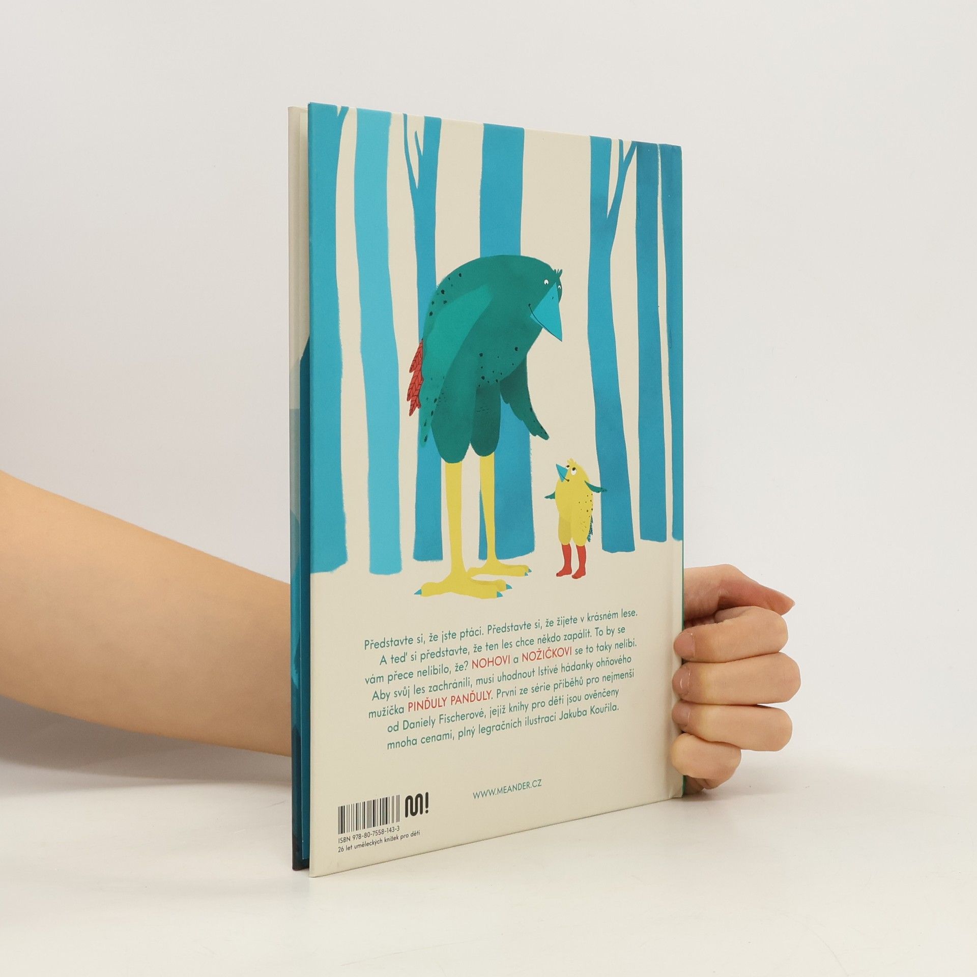 Představte si, že jste ptáci. Představte si, že žijete v krásném lese. A teď si představte, že ten les chce někdo zapálit. To by se vám přece nelíbilo, že? Nohovi a Nožičkovi se to taky nelíbí. Aby svůj les zachránili, musí uhodnout lstivé hádanky ohnivého mužíčka Pinďuly Panďuly. První ze série příběhů pro nejmenší od Daniely Fischerové plné krásných ilustrací Jakuba Kouřila.