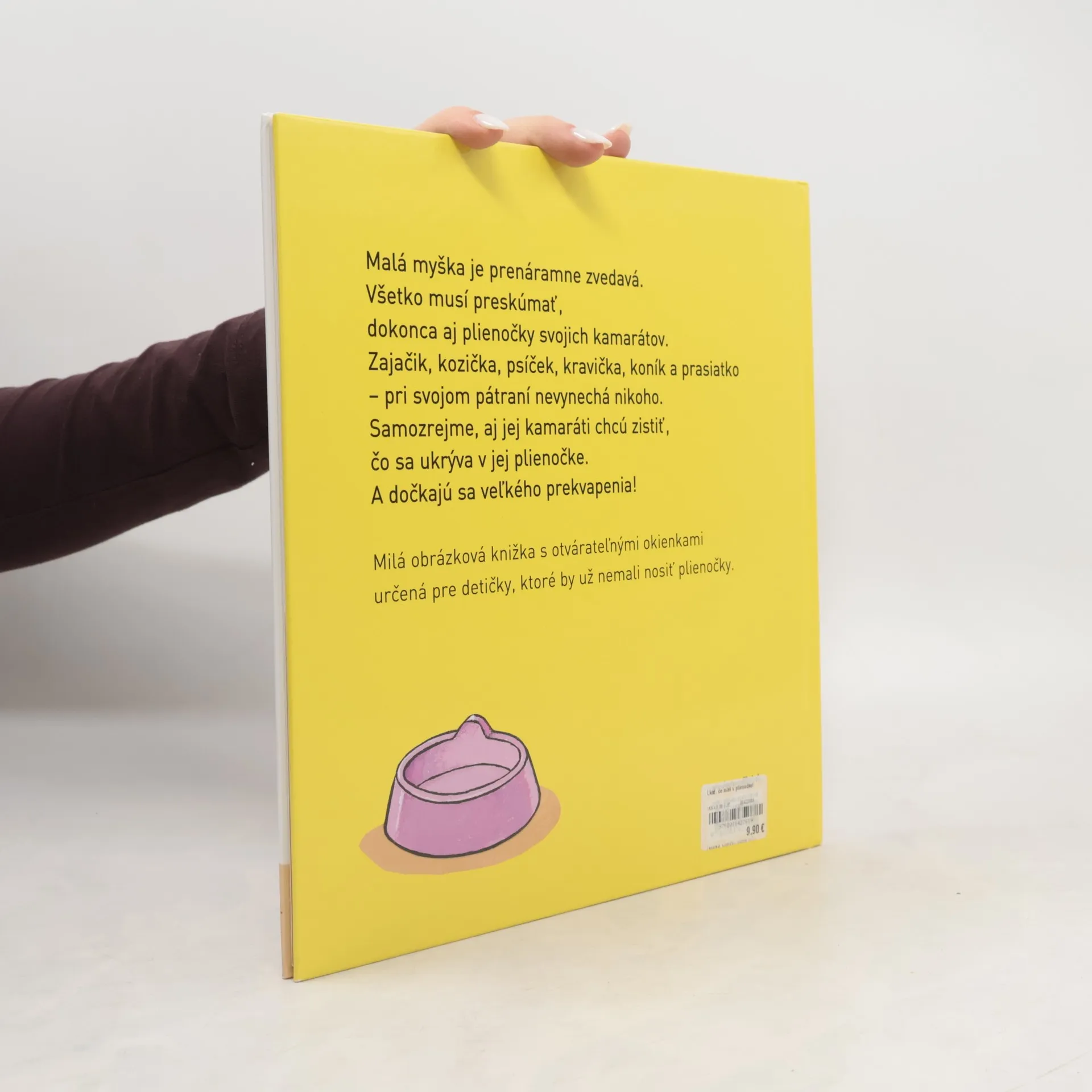 Malá myška je prenáramne zvedavá. Všetko musí preskúmať, dokonca aj plienočky svojich kamarátov. Zajačik, kozička, psíček, kravička, koník a prasiatko – pri svojom pátraní nevynechá nikoho. Samozrejme, aj jej kamaráti chcú zistiť, čo sa ukrýva v jej plienočke. A dočkajú sa veľkého prekvapenia! Milá obrázková knižka s otvárateľnými okienkami určená pre detičky, ktoré by už nemali nosiť plienočky.