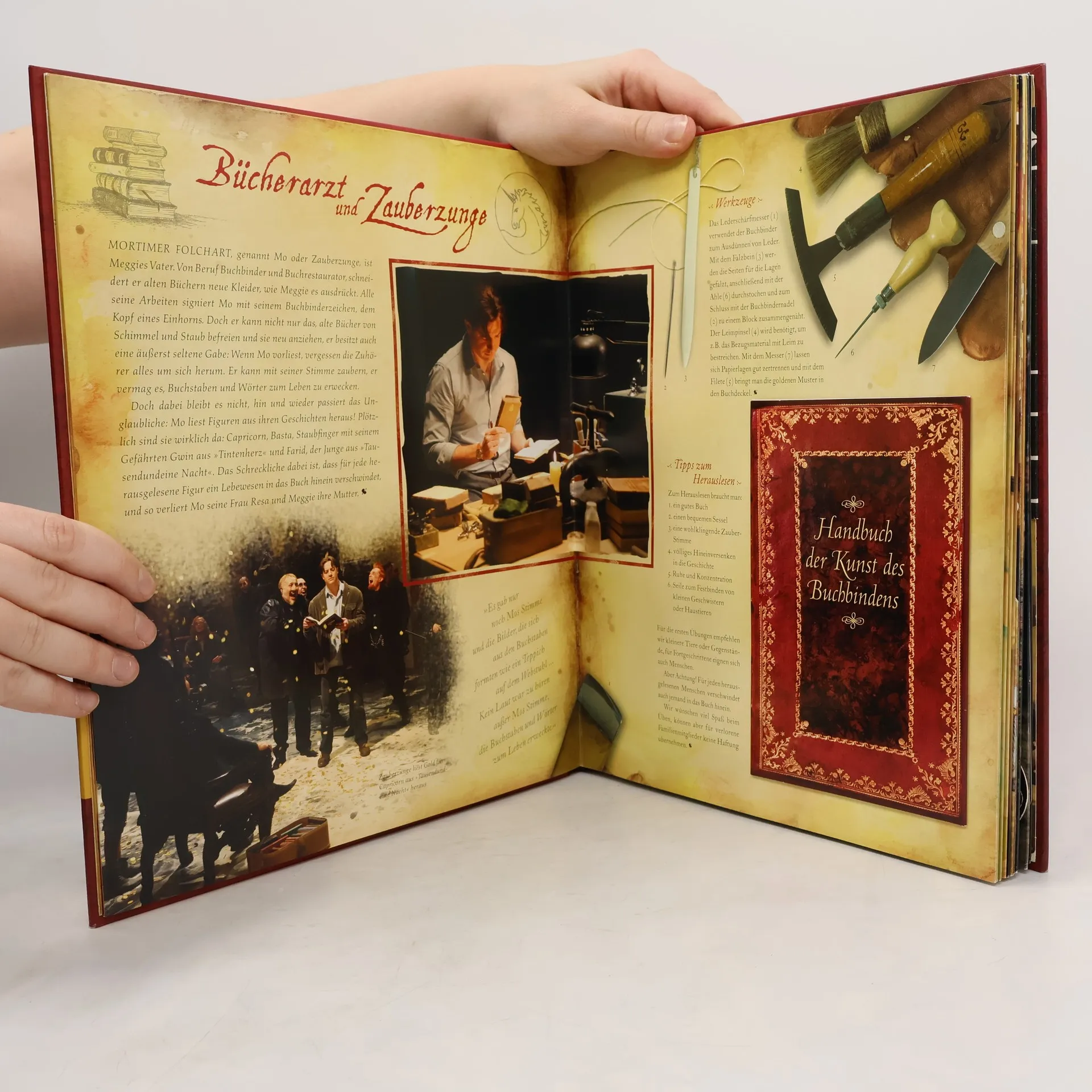 Als wäre man selbst dabei … Ein Zauberbuch für die Tintenwelt-Sehnsucht Einmal Gwyn übers Fell streicheln, Meggies Bücherschatzkiste öffnen, Capricorns Schwert ziehen – der Prachtband zur Welt von Tintenherz bietet eine Fülle von Informationen und aufwendigen Extras und nimmt die Leser mit auf eine faszinierende Entdeckungsreise. Sie führt zu Mo, der Bücherarzt und Zauberzunge zugleich ist, zu Meggie, der Tochter ohne Mutter, zu Fenoglio, dem Herren über Leben und Tod, und natürlich zur Bande des Bösen – Capricorn, seinen Männern und der grausamen Hexe Mortola. Jede Doppelseite ist eine Welt für sich und enthält überraschende Extras zum Mitmachen. Ein Sehnsuchtsbuch für alle, die einmal die Tintenwelt betreten möchten! Kunstwerk, Schatzkiste, Kostbarkeit: das Buch für alle Tintenwelt-Liebhaber! Außergewöhnlich aufwendig gestaltet - mit Panorama-Pop-up, Schiebe- und Ziehklappen, Drehscheibe, Textilien und vielen anderen Extras auf jeder Doppelseite sowie zahlreichen Sachinformationen zu Buchdruck, Mittelalter, Feuerspucken u. v. m.