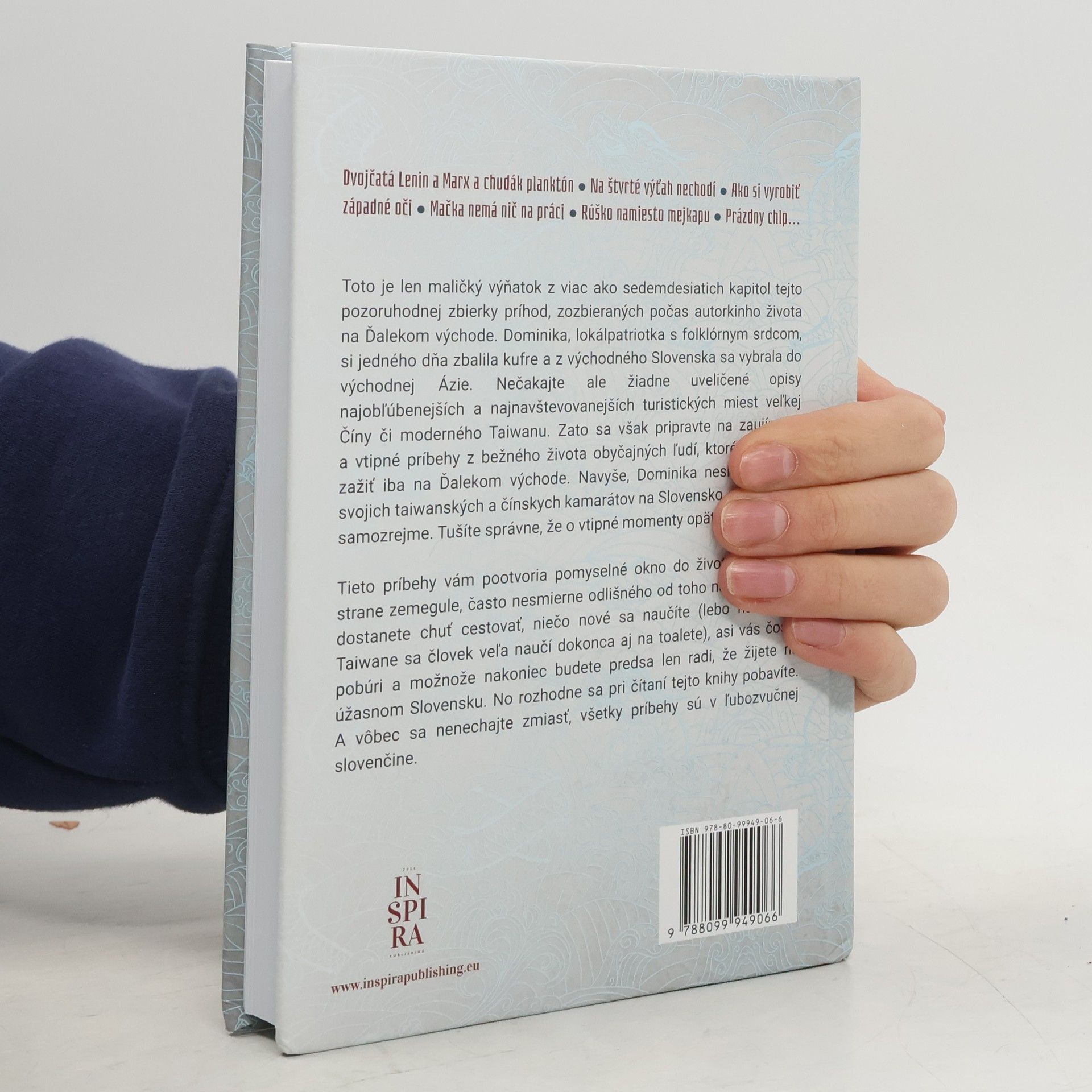Dvojčatá Lenin a Marx a chudák planktón ● Na štvrté výťah nechodí ● Ako si vyrobiť západné oči ● Mačka nemá nič na práci ● Rúško namiesto mejkapu ● Prázdny chlp... Toto je len maličký výňatok z viac ako sedemdesiatich kapitol tejto pozoruhodnej zbierky príhod, zozbieraných počas autorkinho života na Ďalekom východe. Dominika, lokálpatriotka s folklórnym srdcom, si jedného dňa zbalila kufre a z východného Slovenska sa vybrala do východnej Ázie. Nečakajte ale žiadne uveličené opisy najobľúbenejších a najnavštevovanejších turistických miest veľkej Číny či moderného Taiwanu. Zato sa však pripravte na zaujímavé a vtipné príbehy z bežného života obyčajných ľudí, ktoré je možné zažiť iba na Ďalekom východe. Navyše, Dominika neskôr pozvala svojich taiwanských a čínskych kamarátov na Slovensko – východné, samozrejme. Tušíte správne, že o vtipné momenty opäť nebola núdza. Tieto príbehy vám pootvoria pomyselné okno do života na druhej strane zemegule, často nesmierne odlišného od toho nášho. Možno dostanete chuť cestovať, niečo nové sa naučíte (lebo na takom Taiwane sa človek veľa naučí dokonca aj na toalete), asi vás čosi i pobúri a možnože nakoniec budete predsa len radi, že žijete na úžasnom Slovensku. No rozhodne sa pri čítaní tejto knihy pobavíte. A vôbec sa nenechajte zmiasť, všetky príbehy sú v ľubozvučnej slovenčine.