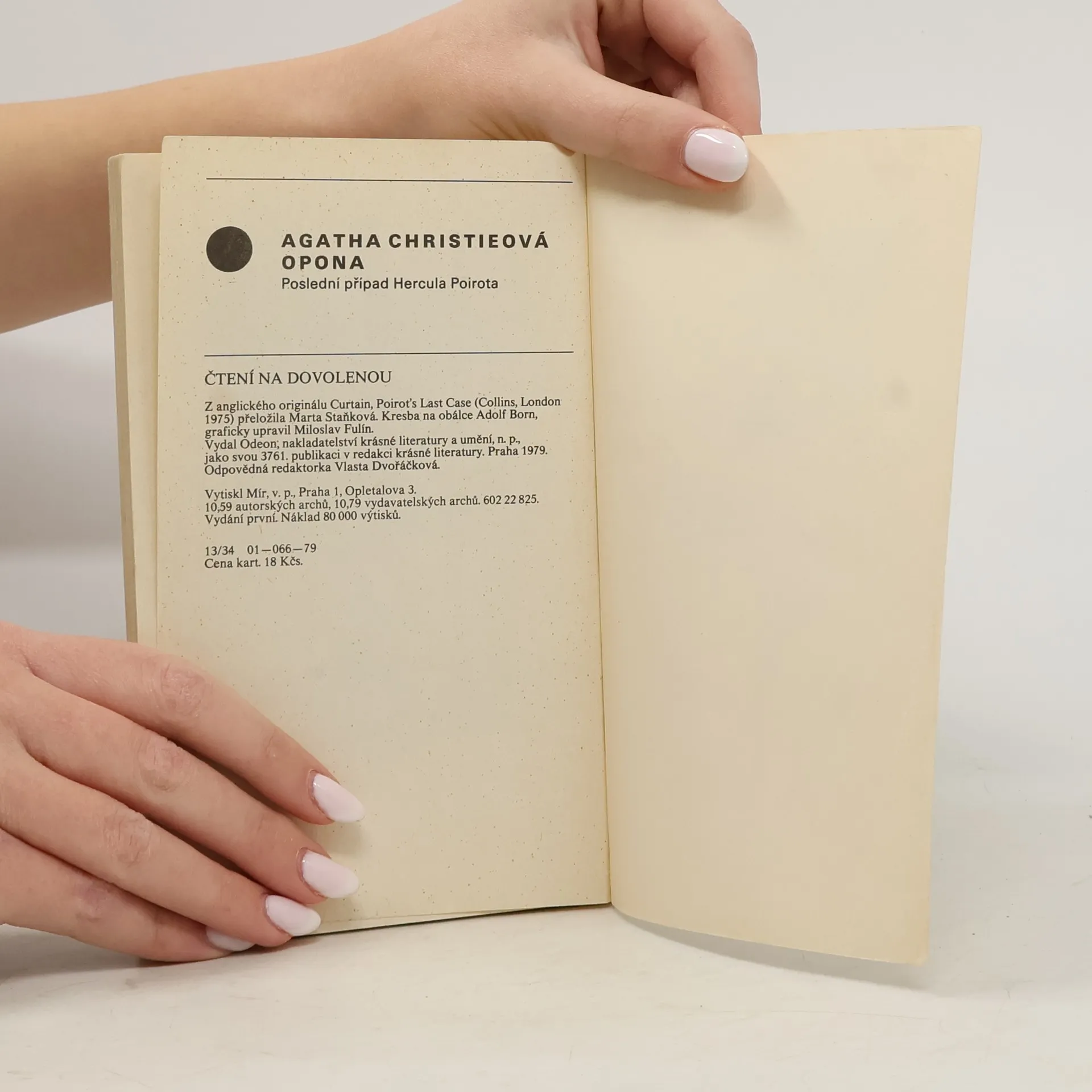 Poslední případ Hercule Poirota. Detektivní román, kterým se anglická autorka navždy rozloučila s oblíbeným literárním hrdinou. V uzavřené skupině lidí dochází k vraždě, která se stane jedním z nejtěžších a nejošidnějších Poirotových případů. Vytuší souvislost se zločinem v minulosti, objeví pachatele a když si uvědomí, že nemá dostatek důkazů pro jeho usvědčení, bere spravedlnost do svých rukou. Shodou okolností se odehrává Poirotův poslední případ na místě, kde začala jeho detektivní dráha. Edice Čtení na dovolenou. 1. vydání.