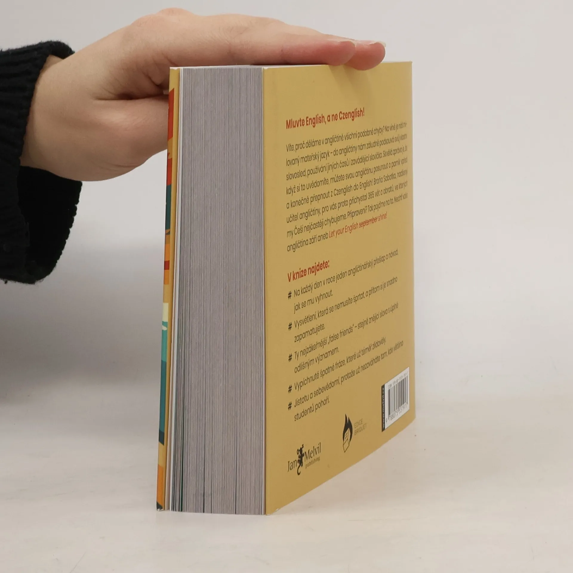 Víte, proč děláme v angličtině všichni podobné chyby?Na vině je náš milovaný mateřský jazyk – do angličtiny nám záludně podsouvá svůj vlastní slovosled, používání jiných časů i zavádějící slovíčka. Skvělá zpráva je, že když si to uvědomíte, můžete svou angličtinu posunout o parník vpřed a konečně přepnout z Czenglish do English!O KNIZEKaždý z nás to občas udělá - složí anglickou větu tak, jak by byla správně v češtině a vytvoří tzv. Czenglish. Někdy máme štěstí a zůstane to bez povšimnutí. Obvykle ale následuje rozpačité ticho, nepochopení nebo dokonce trapas!Že nechcete ani jedno? Pak je tato kniha právě pro vás. Broňa Sobotka, nadšený učitel angličtiny z Brna, vám v ní postupně představí 365 běžně používaných vět a frází, ve kterých my Češi nejčastěji chybujeme, a vysvětlí, jak se jim vyhnout.Cílem knihy totiž není nic menšího než zlepšit vaši angličtinu, ušetřit vás většiny nedorozumění a trapasů… a možná i trochu rozesmát.Tak pojďme na to. Nechť vaše angličtina září aneb Let your English September - shine!V KNIZE NAJDETENa každý den v roce jeden angličtinářský přešlap a návod, jak se mu vyhnout.Vysvětlení, která se nemusíte šprtat, a přitom si je snadno zapamatujete.Ty nejzákeřnější „false friends“ – stejně znějící slova s úplně odlišným významem.Vypíchnuté špatné fráze, které už téměř zlidověly.Jistotu a sebevědomí, protože už nezaváháte tam, kde většina studentů pohoří.