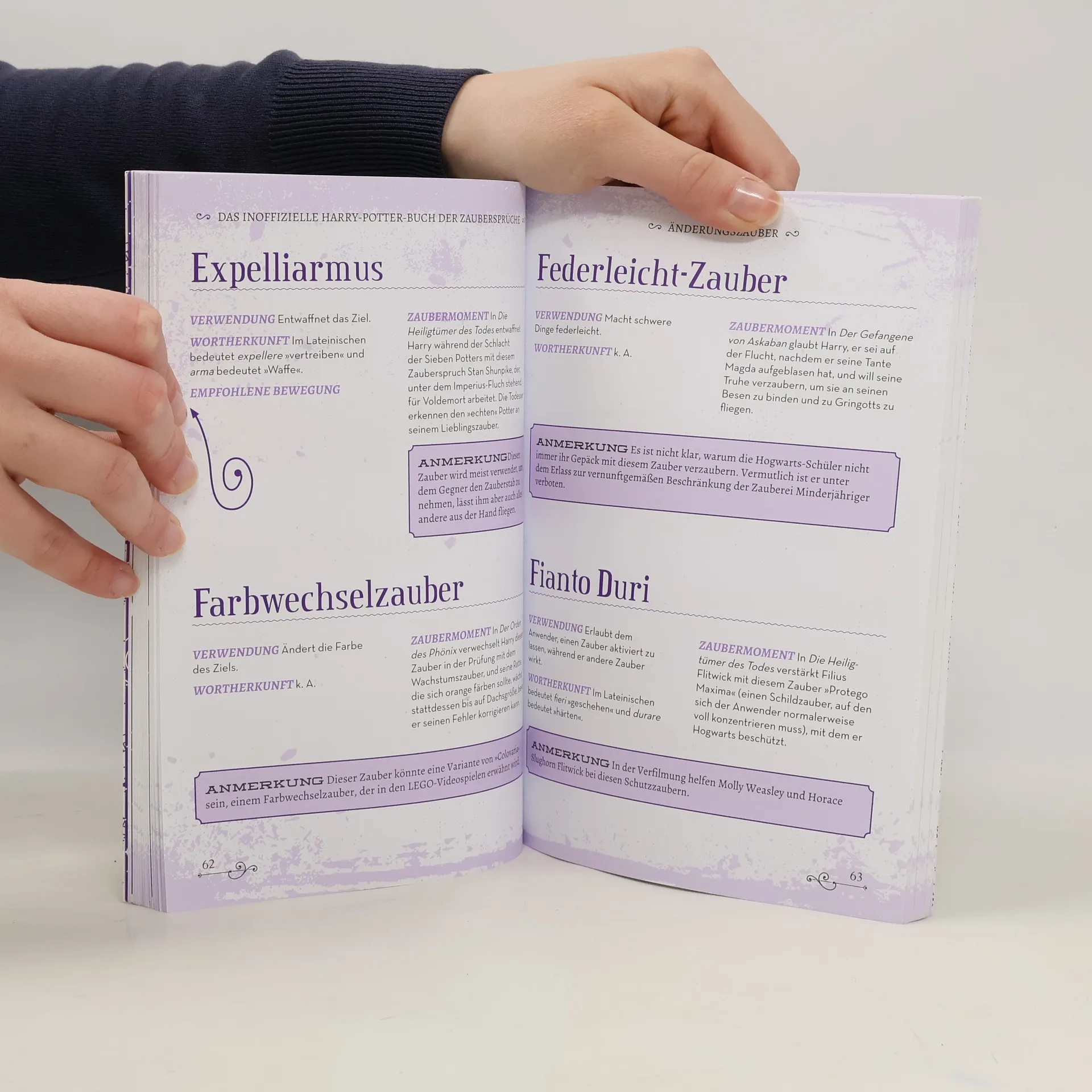 Erlerne die hohe Kunst der Zauberei! Mit diesem Buch hältst du die perfekte Anleitung in Händen. Es erklärt mehr als 240 Zaubersprüche, Flüche und magische Gegenstände aus den Büchern, Filmen und Videospielen des Harry-Potter-Universums – inklusive der Tierwesen-Filme. Hier hat jeder Zauberspruch einen eigenen Eintrag, der dir die Wortherkunft, Verwendung und Wirkung des Zaubers genau erklärt und den magischen Moment beschreibt, in dem er angewendet wurde. Lustige Fakten, Hinweise zur empfohlenen Zauberstabbewegung sowie eine kurze Einführung in die Zauberkunst und ein Überblick über alle Zauberstabhölzer und Zauberstabkerne begleiten dich auf deinem Weg. Filius Flitwick wäre stolz auf dich! »Fliegt bei Flourish and Blotts nur so aus dem Regal!«– Tamsin Jorkins, Bewohnerin der Winkelgasse, über dieses Buch