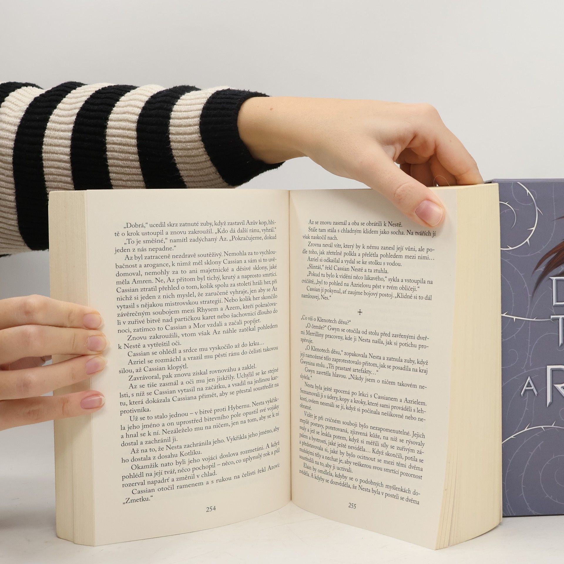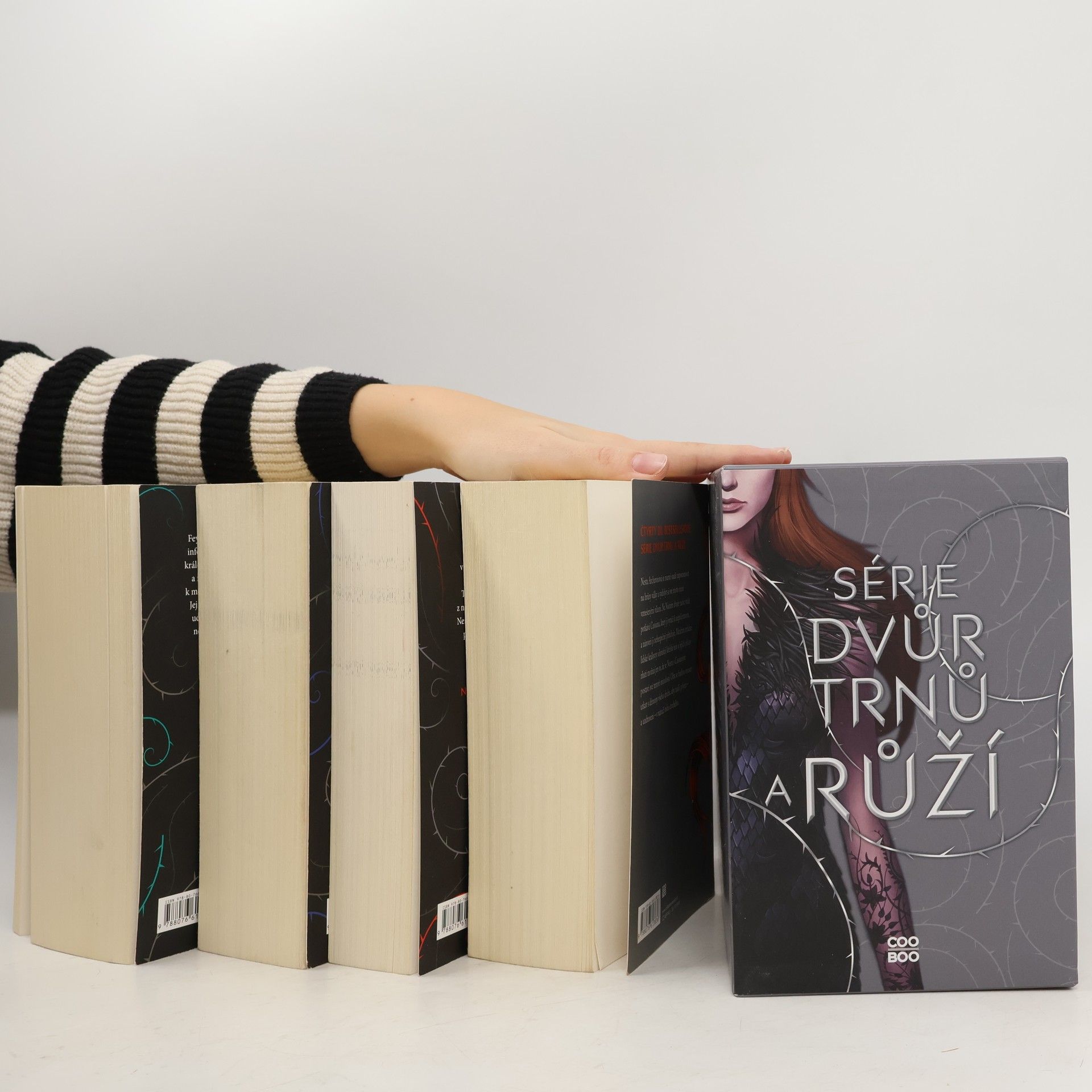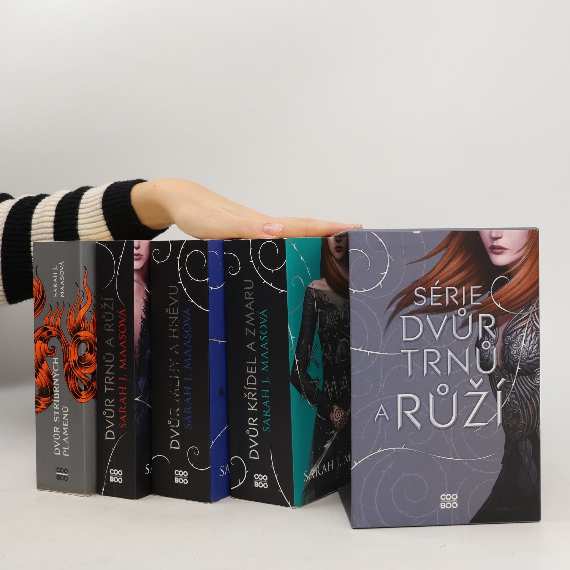 Série Dvůr trnů a růží v jednom boxu.Když devatenáctiletá lovkyně Feyre zabije v lese vlka, odvleče ji podivný tvor do svého doupěte, které se ukáže být jiným světem. Tam zjišťuje, že únosce není zvíře, ale jedna z nesmrtelných bytostí, které kdysi vládly světu. Nenávist se postupně mění v lásku a Feyre musí přijít na způsob, jak zachránit tajuplný svět i svého únosce. Úžasný a mrazivý příběh na motivy Krásky a Zvířete.