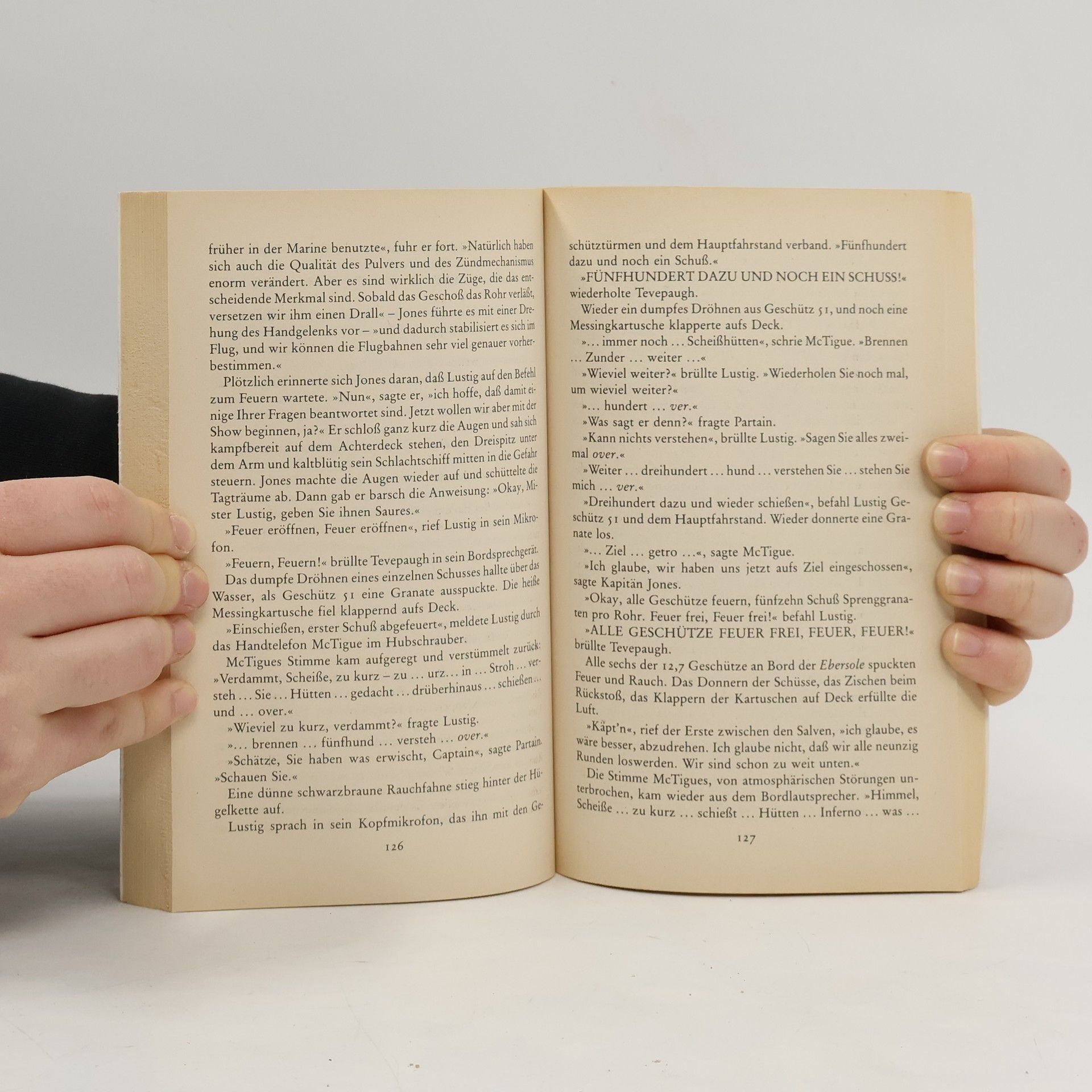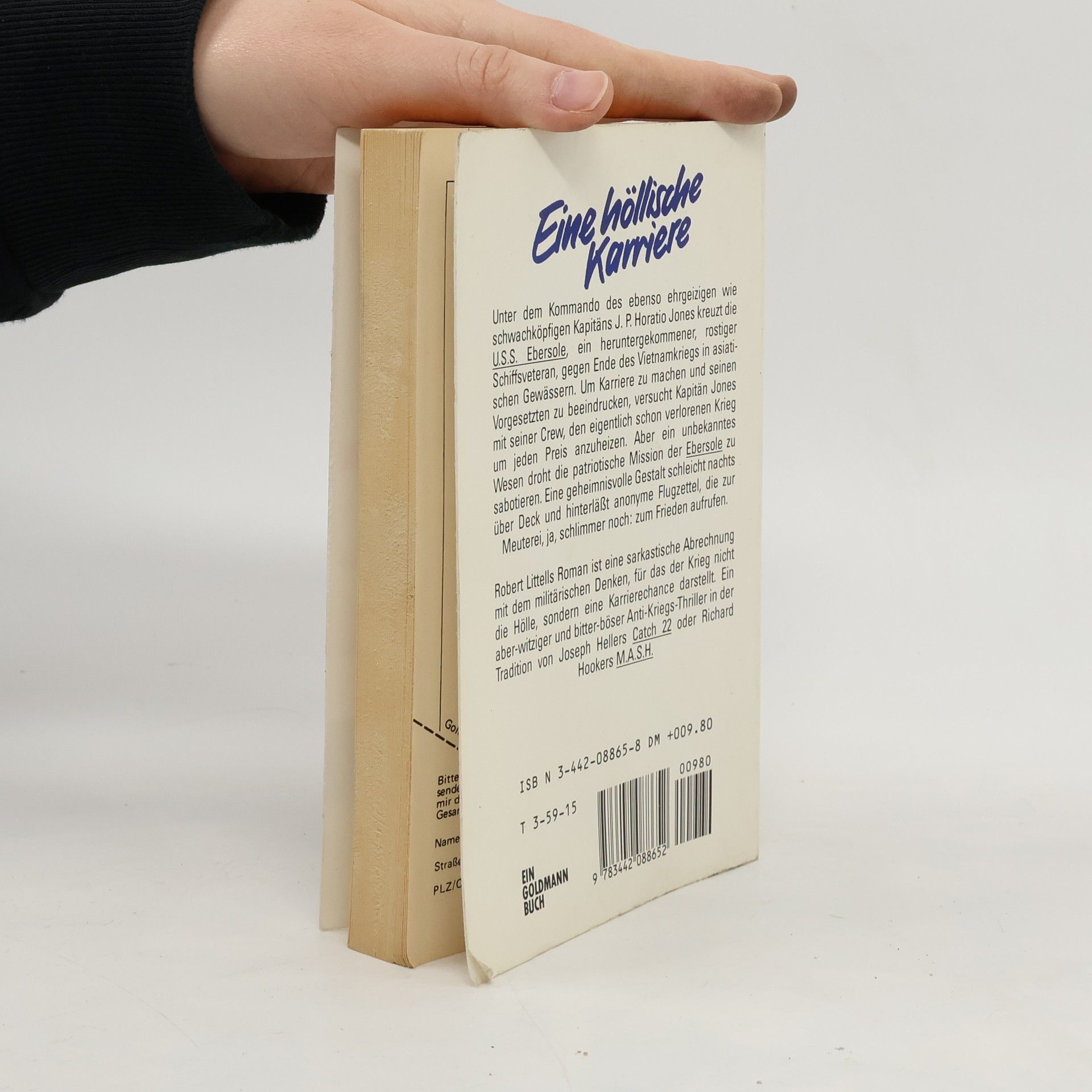 „Unter dem Kommando des ebenso ehrgeizigen wie schwachköpfigen Kapitäns J.P. Horatio Jones kreuzt die U.S.S. Ebersole, ein heruntergekommener, rostiger Schiffsveteran, gegen Ende des Vietnamkriegs in asiatischen Gewässern. Um Karriere zu machen und seinen Vorgesetzten zu beeindrucken, versucht Kapitän Jones mit seiner Crew, den eigentlich schon verlorenen Krieg um jeden Preis anzuheizen. Aber ein unbekanntes Wesen droht die patriotische Mission der Ebersole zu sabotieren. Eine geheimnisvolle Gestalt schleicht nachts über Deck und hinterläßt anonyme Flugzettel, die zur Meuterei, ja, schlimmer noch: zum Frieden aufrufen. Robert Littells Roman ist eine sarkastische Abrechnung mit dem militärischen Denken, für das der Krieg nicht die Hölle, sondern eine Karrierechance darstellt. Ein aber-witziger und bitter-böser Anti-Kriegs-Thriller in der Tradition von Joseph Hellers Catch 22 oder Richard Hookers M.A.S.H.“