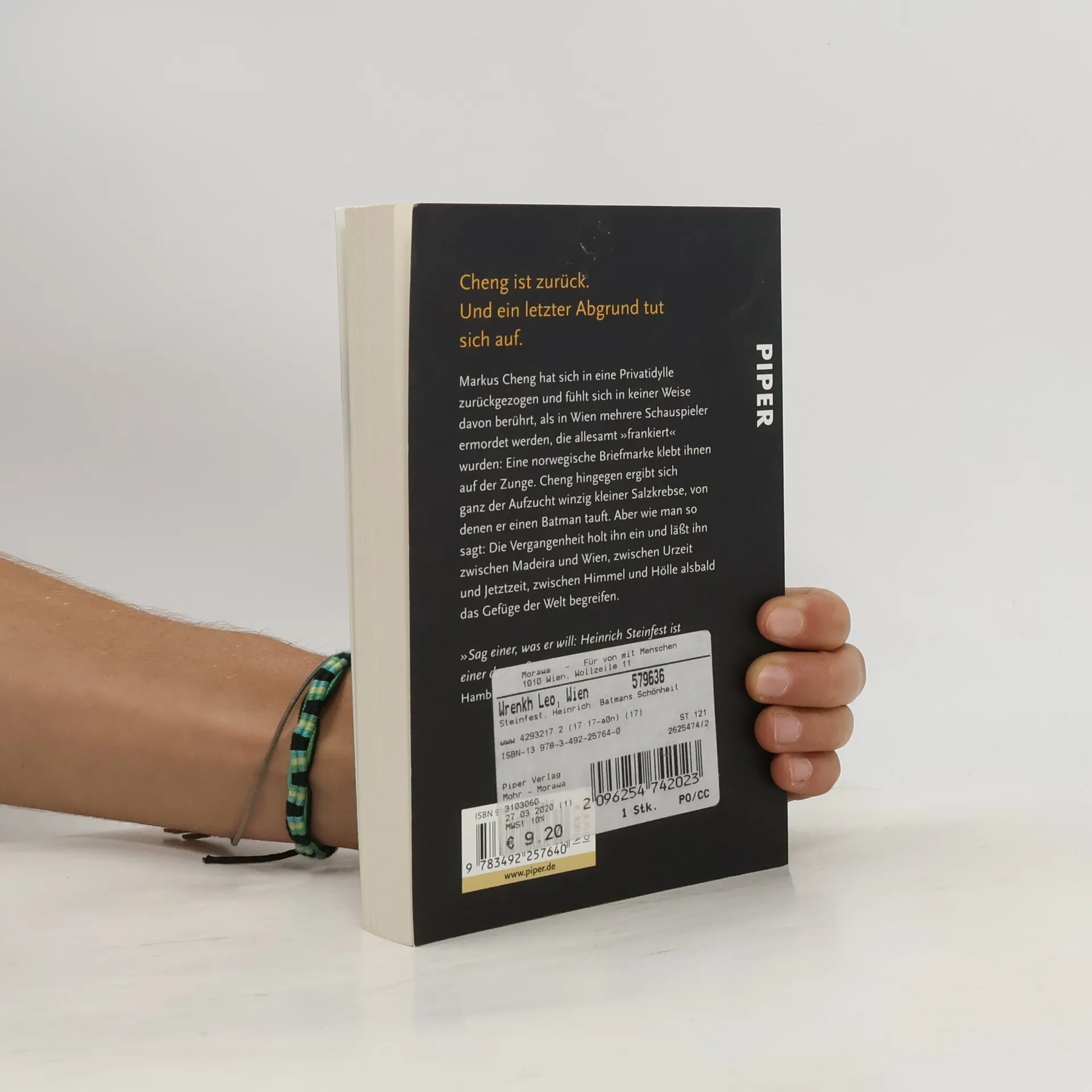 Markus Cheng hat sich in eine Privatidylle zurückgezogen und fühlt sich in keiner Weise davon berührt, als in Wien mehrere Schauspieler ermordet werden, die allesamt »frankiert« wurden: Eine norwegische Briefmarke klebt ihnen auf der Zunge. Cheng hingegen ergibt sich ganz der Aufzucht winzig kleiner Salzkrebse, von denen er einen Batman tauft. Aber wie man so sagt: Die Vergangenheit holt ihn ein und lässt ihn zwischen Madeira und Wien, zwischen Urzeit und Jetztzeit, zwischen Himmel und Hölle alsbald das Gefüge der Welt begreifen.
