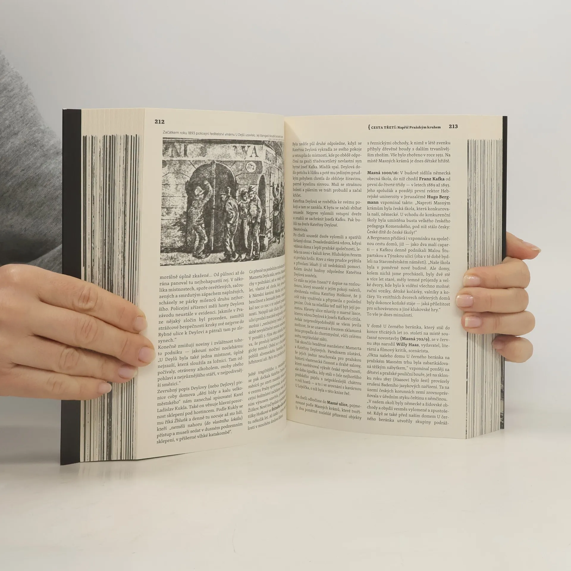 Knihu je možné číst a v duchu (dříve než se čtenář vydá na skutečnou cestu) vstupovat do labyrintu průchozích domů, dvorků a uliček Starého Města, včetně bývalého ghetta a čtvrti na Františku. Do míst, kde žili spisovatelé, malíři, zuřivé domovnice, nenapravitelní opilci (těch tu bylo vždycky dost) i lehké holky. Na Starém Městě žila rodina nejzářivější hvězdy poválečného Hollywoodu, krásná krasobruslařka i pětice bratrů různých osudů hodná Čapkovy Matky. Nejvtipnější český letec z RAF tu svedl svou poslední bitvu a popový idol devadesátých let hledal únik před sebou samým. Bydlel tu geniální kouzelník, nepolepšitelný bigamista a odvážný vzduchoplavec, průkopník emocionalismu (i explosionalismu) a kostelník, co choval na půdě v Železné ulici slepice a vyznamenala ho dánská královna. S touto knihou můžete kráčet do tajemné Řásnovky, na Kozí plácek, do Rybné, Masné, Štupartské a Týnské, kde pozorný chodec nalezne dosud nerozluštěný hebrejský nápis, do Michalské, Melantrichovy, Jilské a dál, až do Kožné, které zdejší kluci po generace říkali Ulička zpráv. Podél asanační spáry u kostela svatých Šimona a Judy, v níž se od nepaměti hrály vrácy nebo vracenky. Hra zvláštních pravidel, kterou jinde nenajdete. I takové je Staré Město.