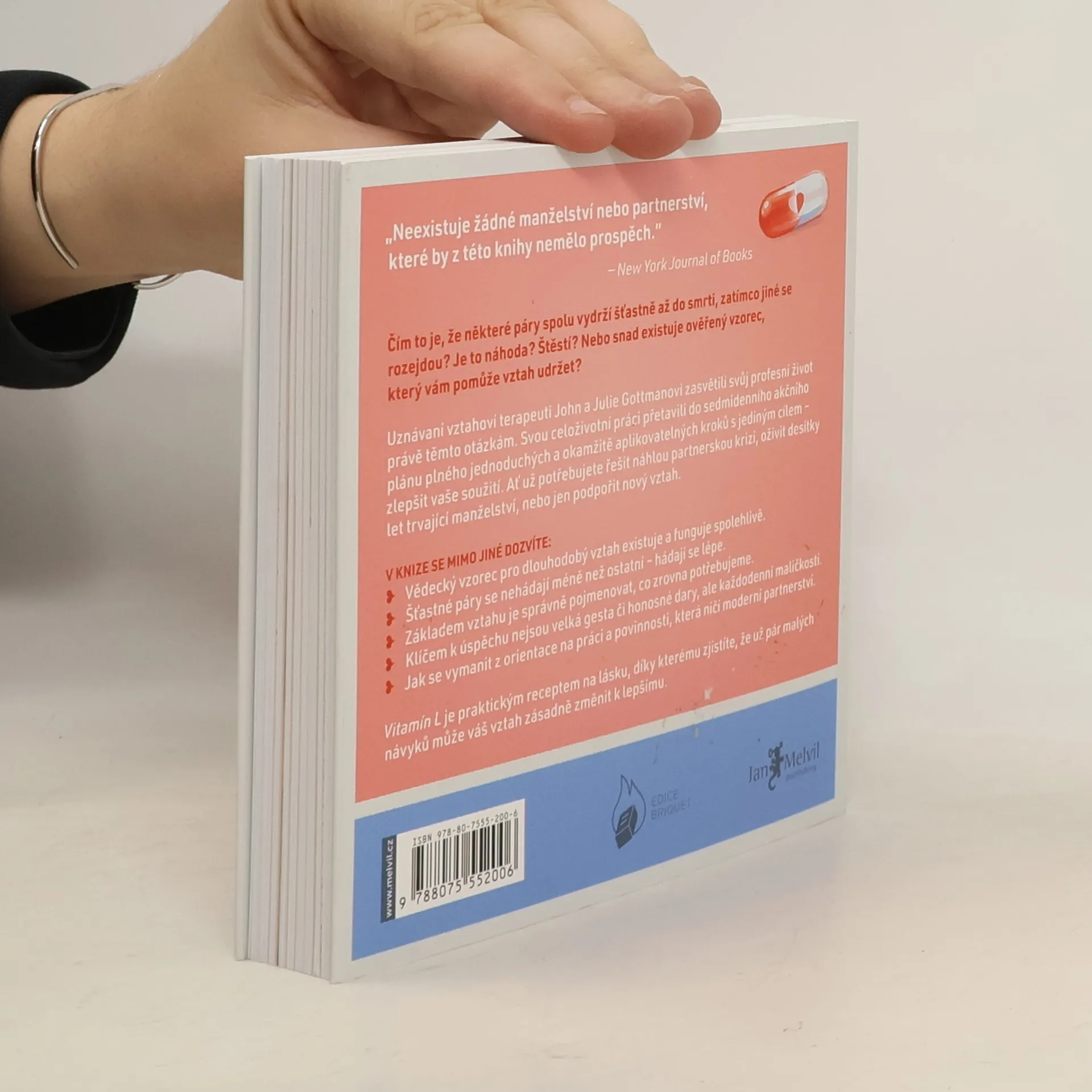 Čím to je, že některé páry spolu vydrží šťastně až do smrti, zatímco jiné se rozejdou? Je to náhoda? Štěstí? Nebo snad existuje ověřený vzorec, který vám pomůže vztah udržet?Uznávaní vztahoví terapeuti John a Julie Gottmanovi zasvětili svůj profesní život právě těmto otázkám. Svou celoživotní práci přetavili do sedmidenního akčního plánu plného jednoduchých a okamžitě aplikovatelných kroků s jediným cílem – zlepšit vaše soužití. Ať už potřebujete řešit náhlou partnerskou krizi, oživit desítky let trvající manželství nebo jen podpořit nový vztah. >>V knize se mimo jiné dozvíte:* Vědecký vzorec pro dlouhodobý vztah existuje a funguje spolehlivě.* Šťastné páry se nehádají méně než ostatní – hádají se lépe.* Základem vztahu je správně pojmenovat, co zrovna potřebujeme.* Klíčem k úspěchu nejsou velká gesta či honosné dary, ale každodenní maličkosti.* Jak přes všechny povinnosti neztratit spojení s tím druhým. Vitamín L je praktickým receptem na lásku, který vám pomůže zaměřit se na to nejpodstatnější. Díky němu zjistíte, že už pár malých návyků může váš vztah zásadně změnit k lepšímu.