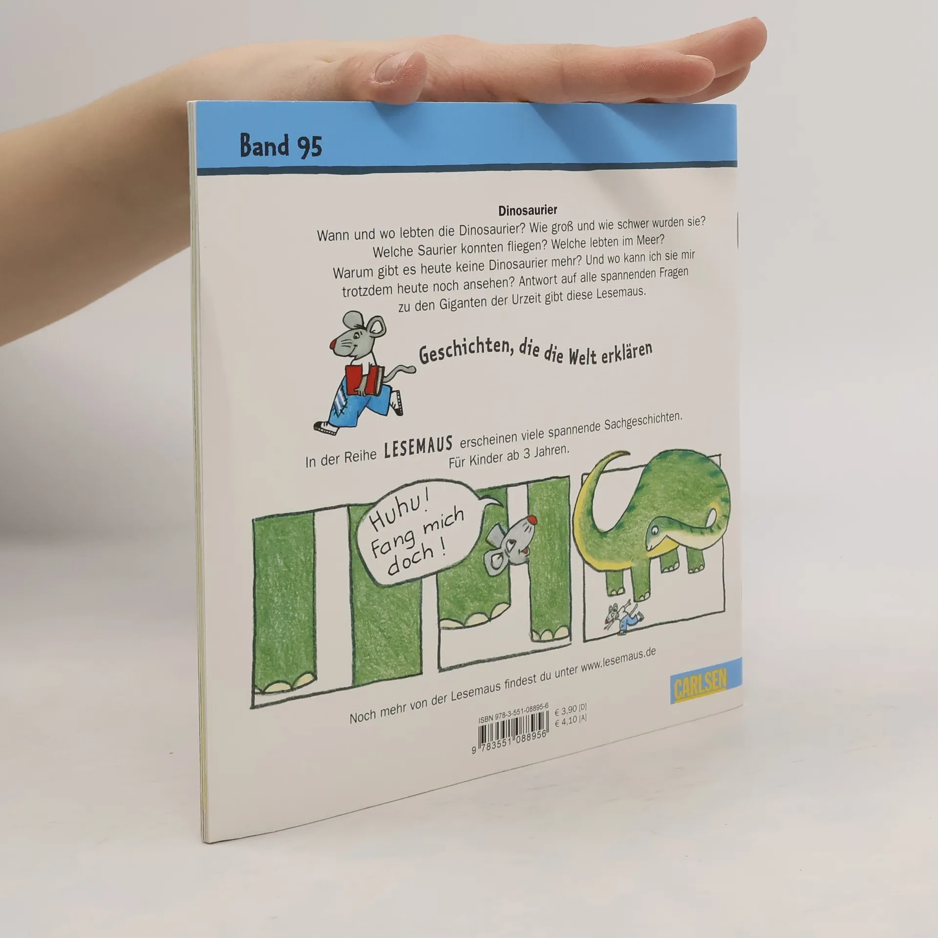 *** Alles über Dinos - erstes Wissen für Kinder ab 3 Jahren *** Wann und wo lebten die Dinosaurier? Wie groß und wie schwer wurden sie? Welche Saurier konnten fliegen? Welche lebten im Meer? Warum gibt es heute keine Dinosaurier mehr? Und wo kann ich sie mir trotzdem heute noch ansehen? Antworten auf alle spannenden Fragen zu den Giganten der Urzeit gibt diese Lesemaus-Geschichte. *** LESEMAUS – Geschichten, die die Welt erklären! *** Die Bilderbücher für Kinder ab 3 Jahren sind ideal zum gemeinsamen Anschauen und Vorlesen. Verständliche Texte und hochwertige Illustrationen vermitteln erstes Sachwissen zu wichtigen Themen aus dem Kinderalltag. Empfohlen von der Stiftung Lesen.
