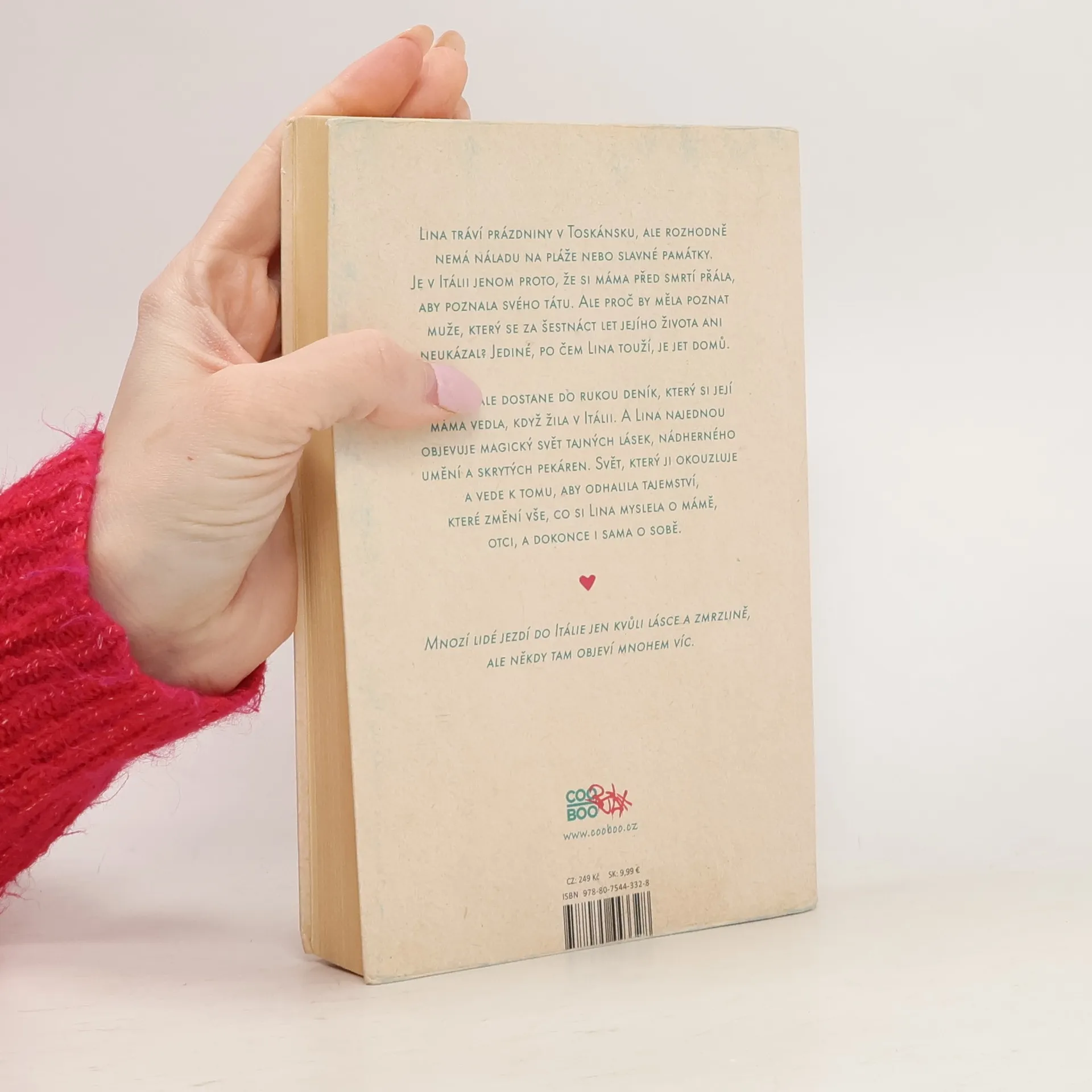 Lina tráví prázdniny v Toskánsku, ale rozhodně nemá náladu na pláže nebo slavné památky. Je v Itálii jenom proto, že si máma před smrtí přála, aby poznala svého otce. Ale proč by měla poznat otce, který se za šestnáct let jejího života ani neukázal? Jediné, po čem Lina touží, je jet domů. Pak se jí ale dostane do rukou deník, který si její máma vedla, když žila v Itálii. A Lina najednou objevuje magický svět tajných lásek, nádherného umění a skrytých pekáren. Svět, který ji okouzluje a vede k tomu, aby odhalila tajemství, které změní vše, co si Lina myslela o mámě, otci, a dokonce i sama o sobě.