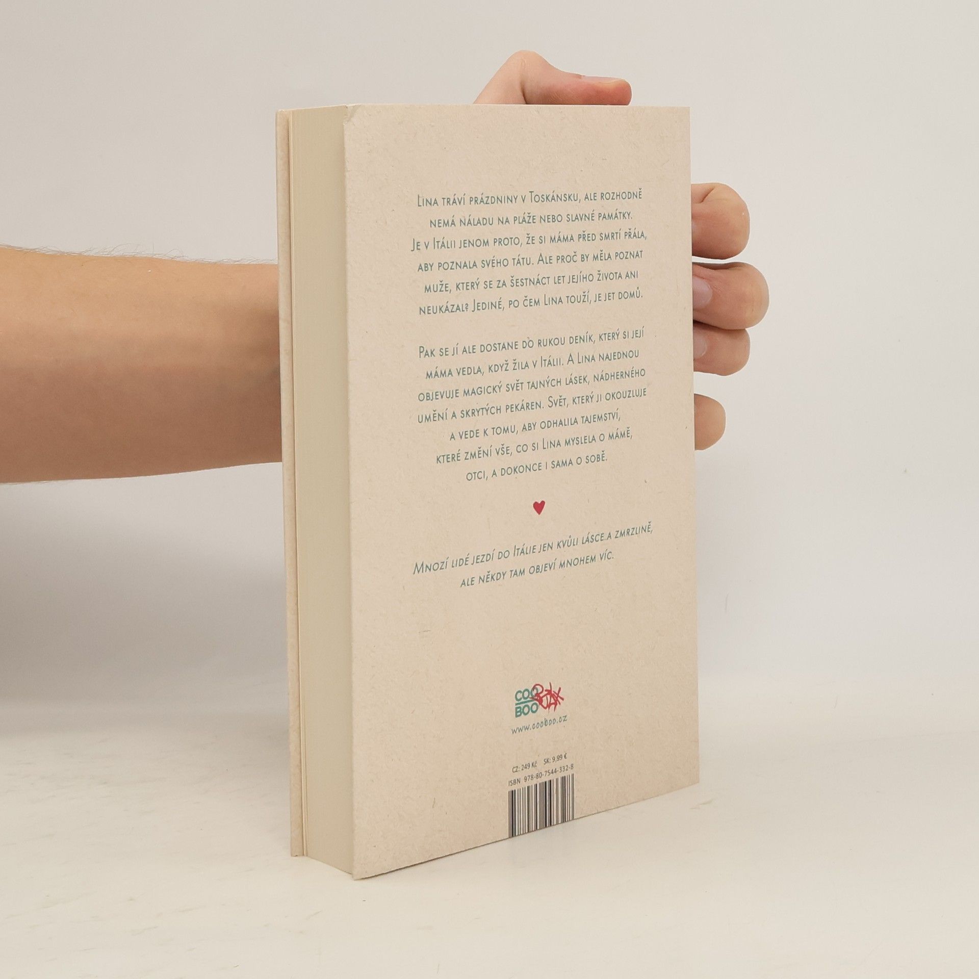 Lina tráví prázdniny v Toskánsku, ale rozhodně nemá náladu na pláže nebo slavné památky. Je v Itálii jenom proto, že si máma před smrtí přála, aby poznala svého otce. Ale proč by měla poznat otce, který se za šestnáct let jejího života ani neukázal? Jediné, po čem Lina touží, je jet domů. Pak se jí ale dostane do rukou deník, který si její máma vedla, když žila v Itálii. A Lina najednou objevuje magický svět tajných lásek, nádherného umění a skrytých pekáren. Svět, který ji okouzluje a vede k tomu, aby odhalila tajemství, které změní vše, co si Lina myslela o mámě, otci, a dokonce i sama o sobě.