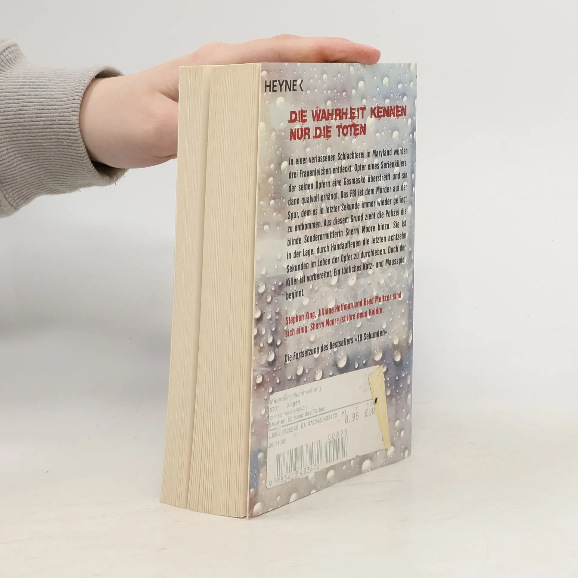 Die Wahrheit kennen nur die Toten In einer verlassenen Schlachterei in Maryland werden drei Frauenleichen entdeckt, Opfer eines Serienkillers, der seinen Opfern eine Gasmaske überstreift und sie dann qualvoll erhängt. Das FBI ist dem Mörder auf der Spur, dem es in letzter Sekunde immer wieder gelingt, zu entkommen. Aus diesem Grund zieht die Polizei die blinde Sonderermittlerin Sherry Moore hinzu. Sie ist in der Lage, durch Handauflegen die letzten achtzehn Sekunden im Leben der Opfer zu durchleben. Doch der Killer ist vorbereitet. Ein tödliches Katz-und-Maus-Spiel beginnt.