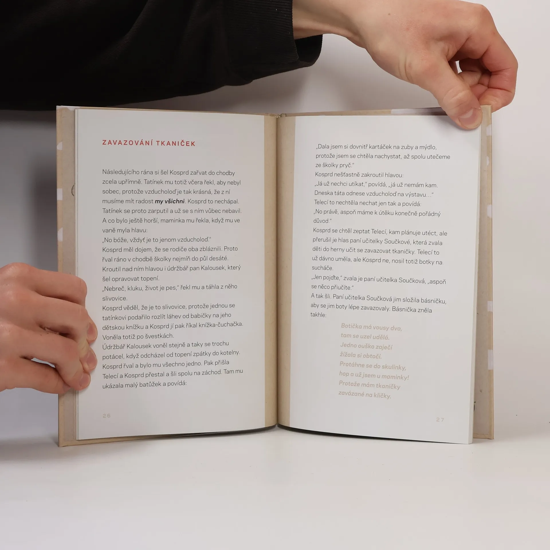 Malý Kosprd, hrdina naší knížky, miluje tatínkovu dílnu a moc rád tátovi pomáhá při výrobě vzducholodi, ale jednoho dne se rodiče rozhodnou, že jejich syn musí začít chodit do školky. Toto rozhodnutí se mu nelíbí, a velmi hlasitě protestuje – při příchodu do školky. Téměř každý rodič, který vedl poprvé své dítko do školky, ví, o čem je řeč. A také spousta dětí zná takovou situaci. V našem příběhu však malý Kosprd má velké štěstí, protože hned první den ve školce potká báječnou kamarádku s fantazií a zajímavými nápady, malou Telecí… Vyprávění zachycuje každodenní momenty, které se mohou přihodit v kterékoliv mateřské školce, a velmi vtipně i s nadsázkou popisuje život předškoláků a jejich nápady, nad nimiž se dospělí nestačí divit. Přátelství Kosprda a Telecí, jejich „vejšplechty“ i dobrodružství jsou zachyceny věrohodně a vtipně.
