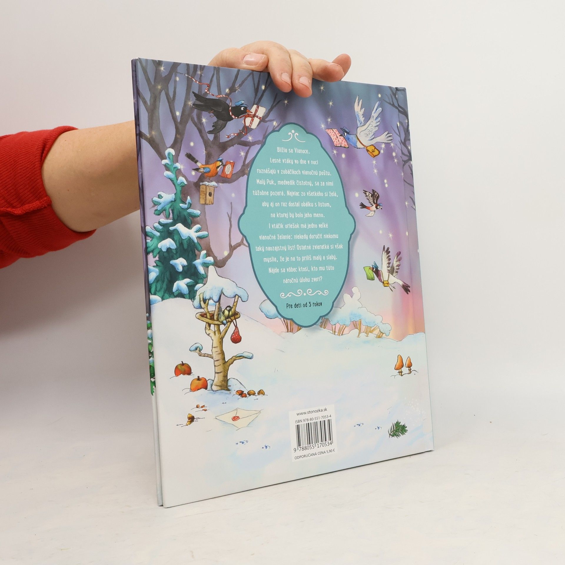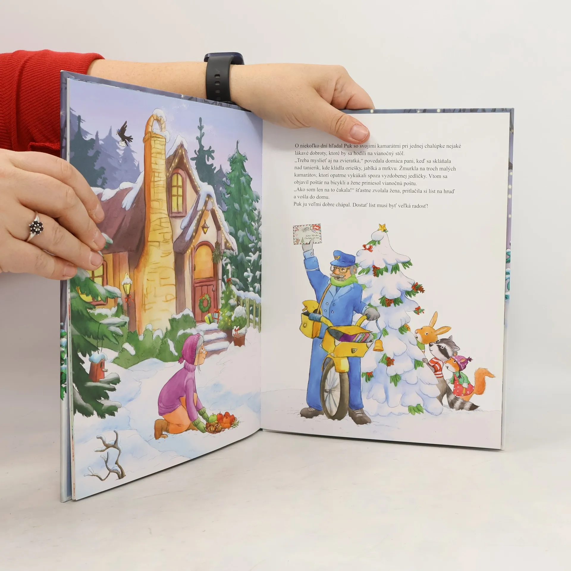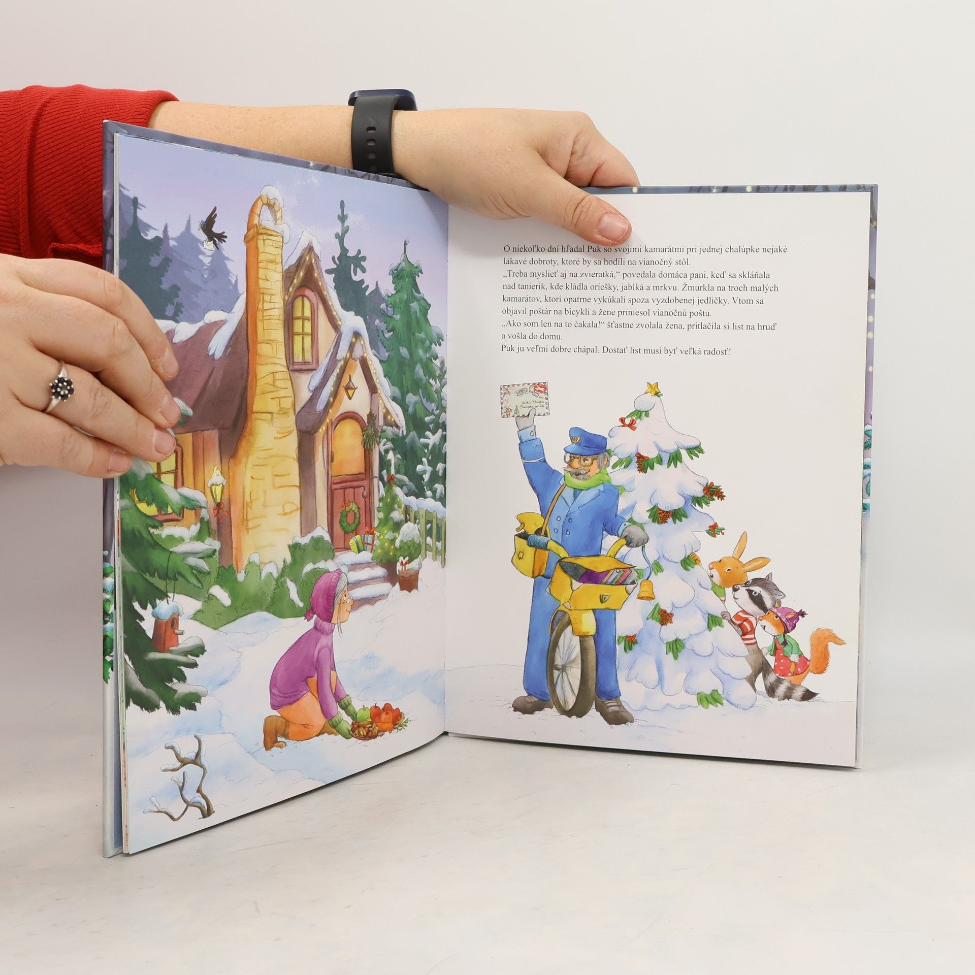 Blížia sa Vianoce. Lesné vtáky vo dne v noci roznášajú v zobáčikoch vianočnú poštu. Malý Puk, medvedík čistotný,sa za nimi túžobne pozerá. Najviac zo všetkého si želá,aby aj on raz dostal obálku s listom,na ktorej by bolo jeho meno. I vtáčik oriešok má jedno veľké vianočné želanie: niekedy doručiť niekomu taký ozajstný list! Ozajstné zvieratká si však myslia, že je na to príliš malý a slabý. Nájde sa vôbec ktosi,kto mu túto náročnú úlohu zverí?