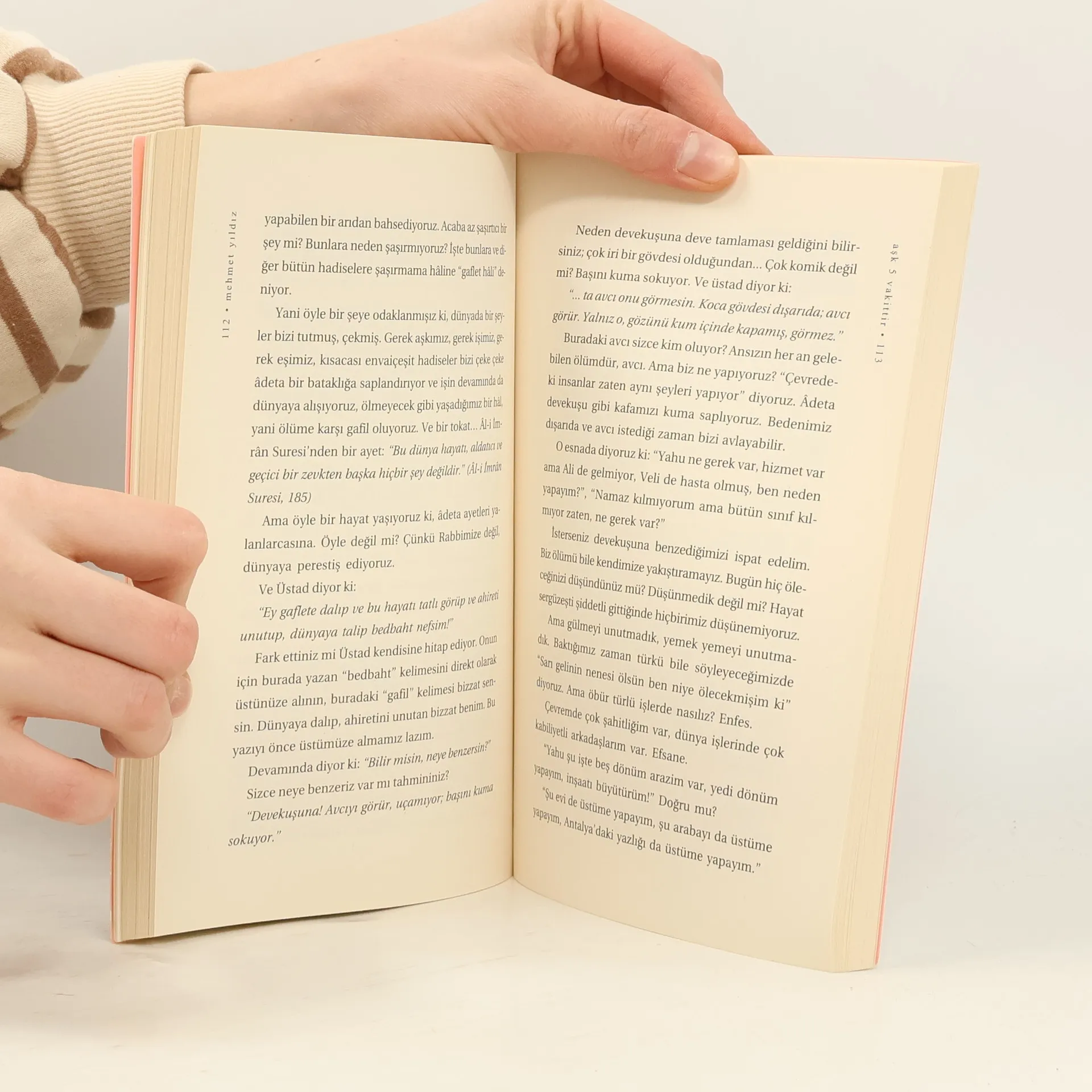 Gelirken sen getirmediğin, giderken de gitmelerine mani olamadığın hiçbir şeye benim diyemezsin.Benim diyemediğin şeyden hak talep edemezsin.Hak talep edemediğin şeyden şikâyet edemezsin.Ama aldandın bir kere.Damarlarına kadar işlemiş haram sevdaya mukabil, sana şah damarından daha yakın olduğunu söyleyen bir Rabbin vardı.Duymadın!Kimse bilmez diye derinlere gömdüğün dertlerine mukabil, yarattığı kalbin atomlarına kadar işiten Rabbin vardı.Anlamadın!Onların batıp giden sevgilileri çiçek alırken, bizim Sevdiğimiz (c.c.) tüm çiçekleri yarattı.Görmedin!Şimdi hüzünlü yüreğine şöyle söyle dostum:Geçmez sandığın ne varsa geçiyor.İçin geçiyor önce.Sonra anıların gözlerinin önünden geçiyor.Geçmez sandığın kabuk tutan yaraların da geçiyor.Ben de gidiyorum artık, gözümün önünden kabrim geçiyor.Kestiğim elimi ispat olsun diye gözlerimin önünde tamir eden Allah'ım!Kırık gönlümü başka cerrahlara götürdüğüm her gün için affet!Tırtıl öldüm demiş, Allah kelebek yaratmış...(Tanıtım Bülteninden)