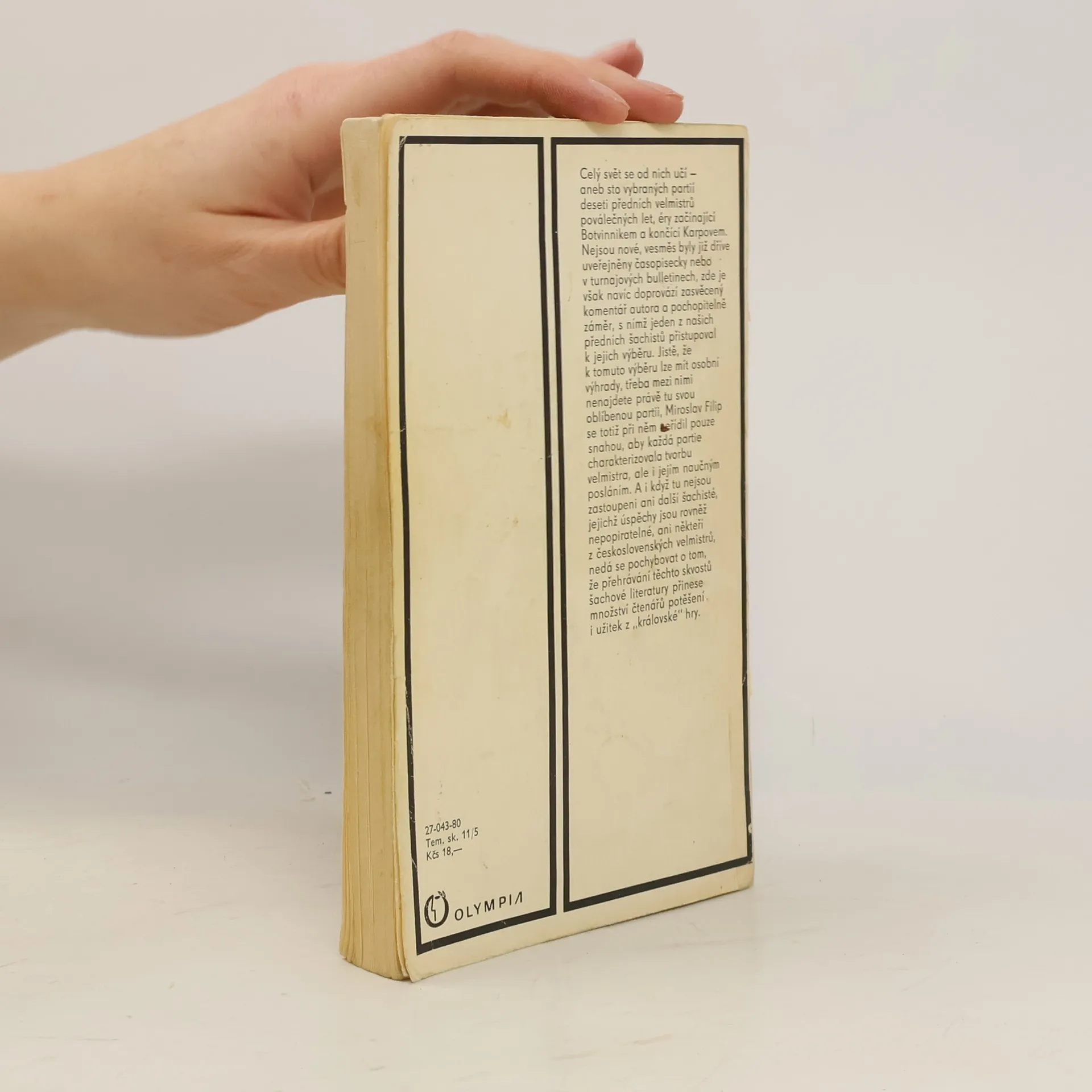 Celý svět se od nich učí – aneb sto vybraných partií deseti předních velmistrů poválečných let, éry začínající Botvinnikem a končící Karpovem. Nejsou nové, vesměs byly již dříve uveřejněny časopisecky nebo v turnajových bulletinech, zde je však navíc doprovází zasvěcený komentář autora a pochopitelně záměr, s nímž jeden z našich předních šachistů přistupoval k jejich výběru. Jistě, že k tomuto výběru lze mít osobní výhrady, třeba mezi nimi nenajdete právě tu svou oblíbenou partii, Miroslav Filip se totiž při něm neřídil pouze snahou, aby každá partie charakterizovala tvorbu velmistra, ale i jejím naučným posláním, A i když tu nejsou zastoupeni ani další šachisté, jejichž úspěchy jsou rovněž nepopiratelné, ani někteří z československých velmistrů, nedá se pochybovat o tom, že přehrávání těchto skvostů šachové literatury přinese množství čtenářů potěšení i užitek z „královské“ hry.